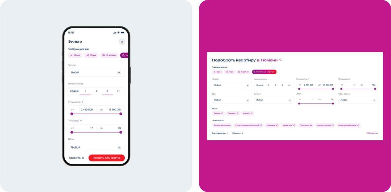 Чтобы упростить интерфейс, совместно с заказчиком мы провели исследование. По результатам исследования переработали интерфейс фильтра и расположили элементы в удобном для пользователей порядке.
