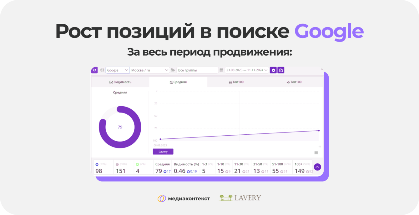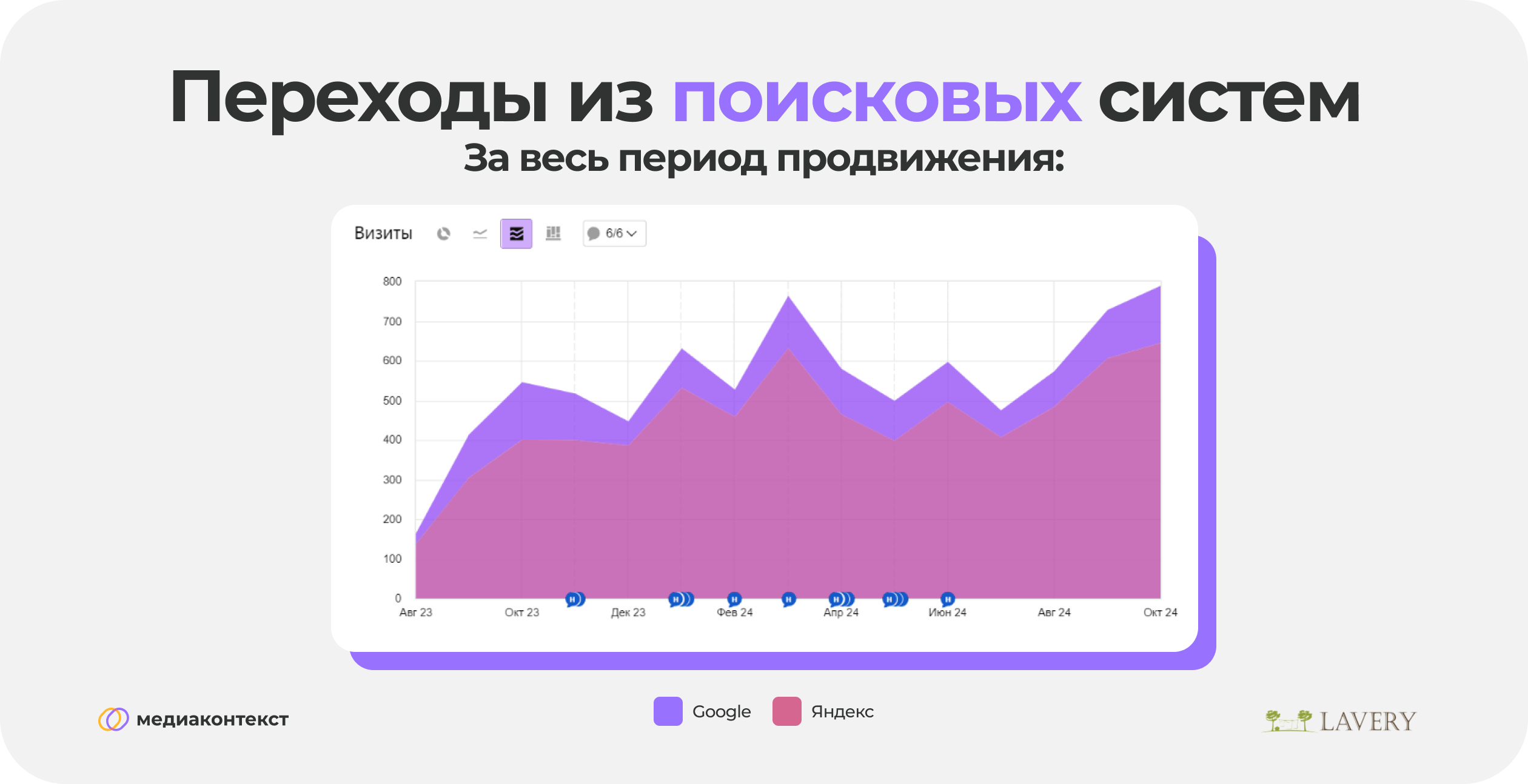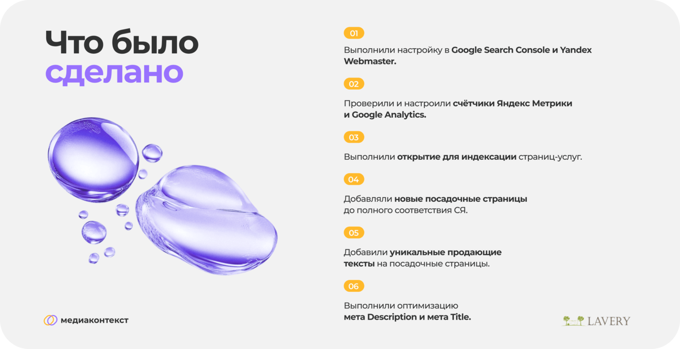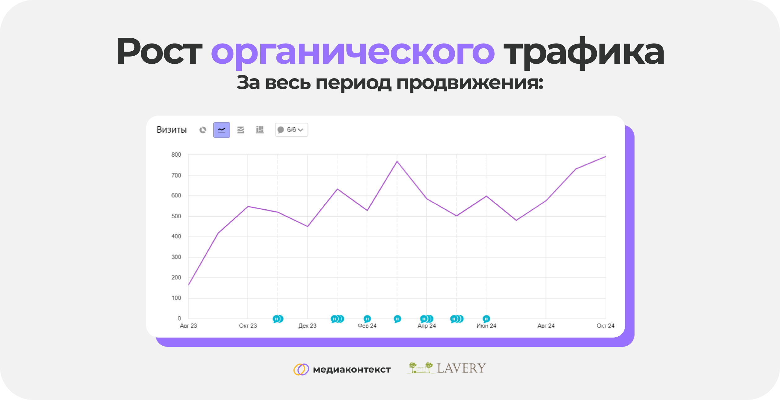 Сеть химчисток в Москве и МО Lavery основана в 2007 году. С 2020 года осуществляется доставка от приемных пунктов по Москве и МО, сеть активно развивается и открывает новые приемные пункты. Компания открыта уже продолжительное время, но сайт не был оптимизирован и занимал практически нулевые позиции в поисковых системах. В августе 2023 года Lavery обратились за SEO-оптимизацией и продвижением, с целью повысить показатель ТОП-10 в поисковых системах, а также увеличить количество поискового трафика.