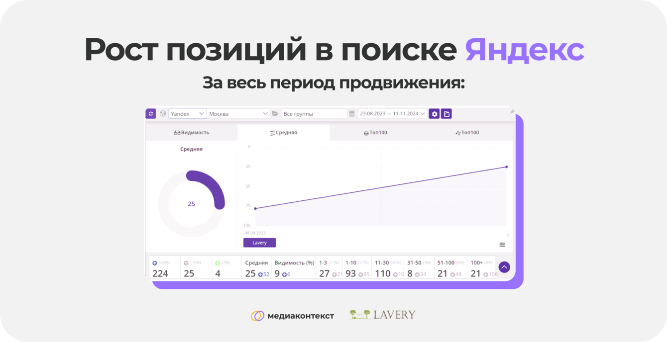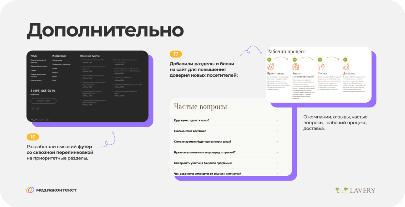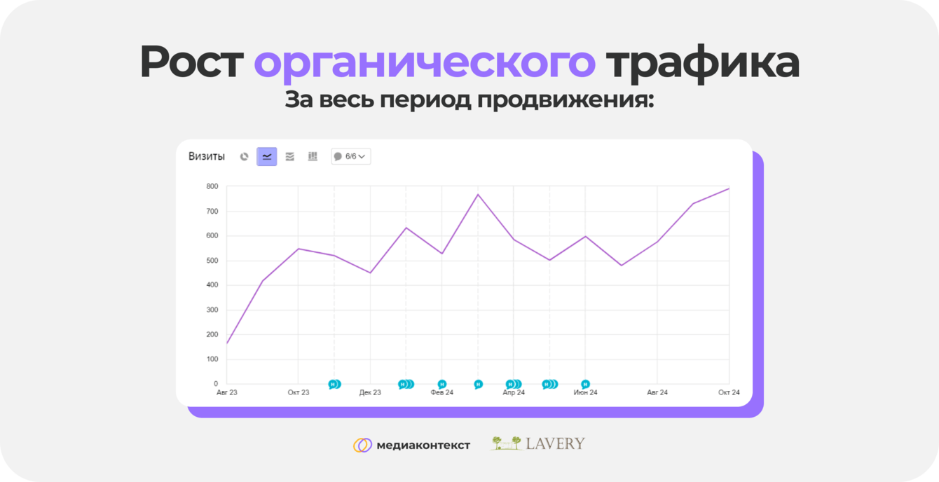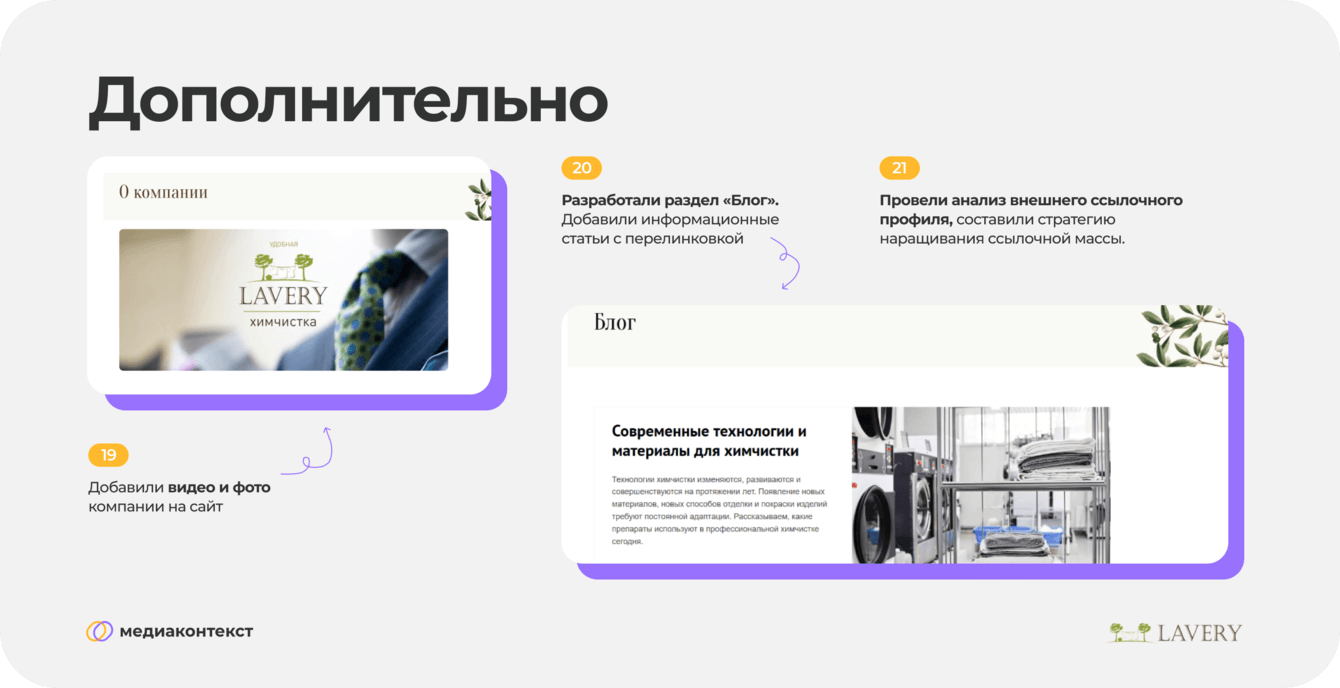Сеть химчисток в Москве и МО Lavery основана в 2007 году. С 2020 года осуществляется доставка от приемных пунктов по Москве и МО, сеть активно развивается и открывает новые приемные пункты. Компания открыта уже продолжительное время, но сайт не был оптимизирован и занимал практически нулевые позиции в поисковых системах. В августе 2023 года Lavery обратились за SEO-оптимизацией и продвижением, с целью повысить показатель ТОП-10 в поисковых системах, а также увеличить количество поискового трафика.