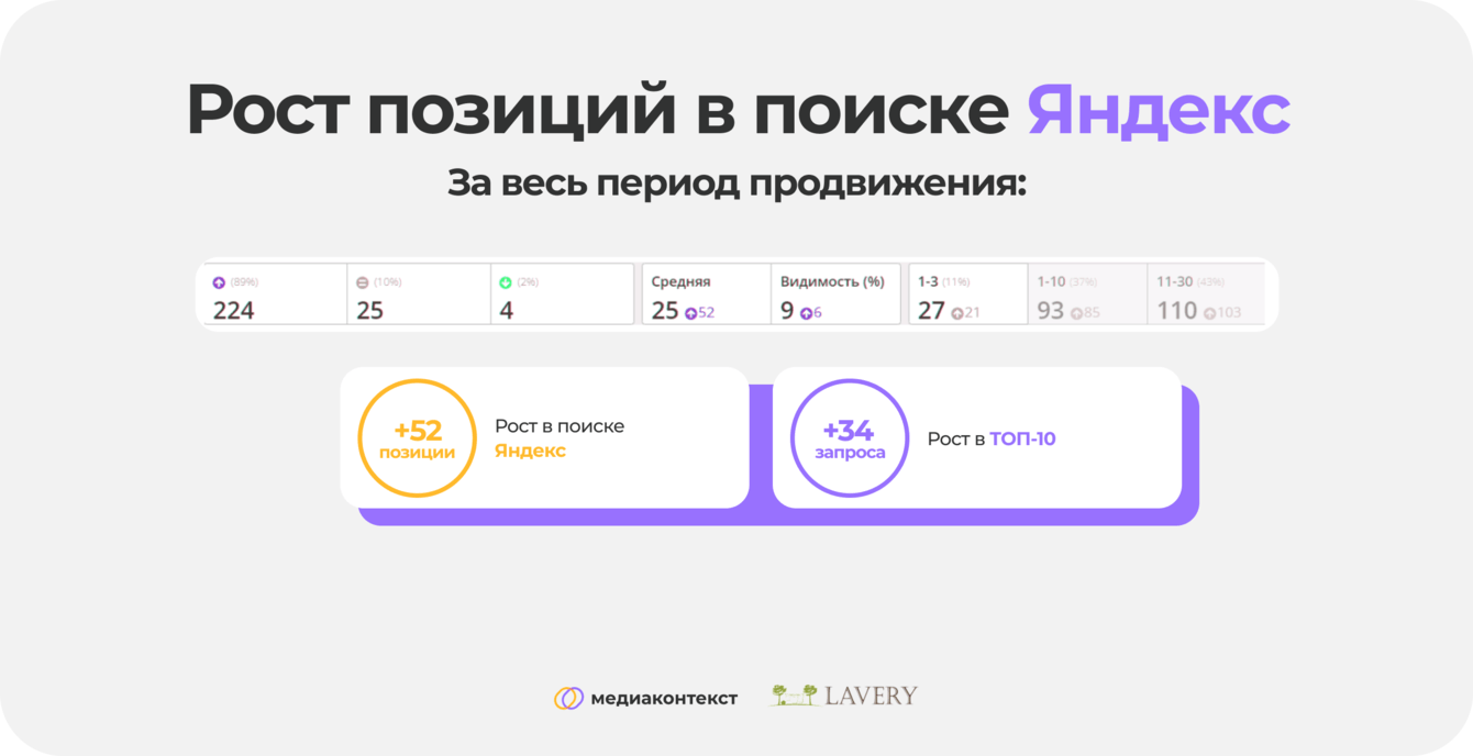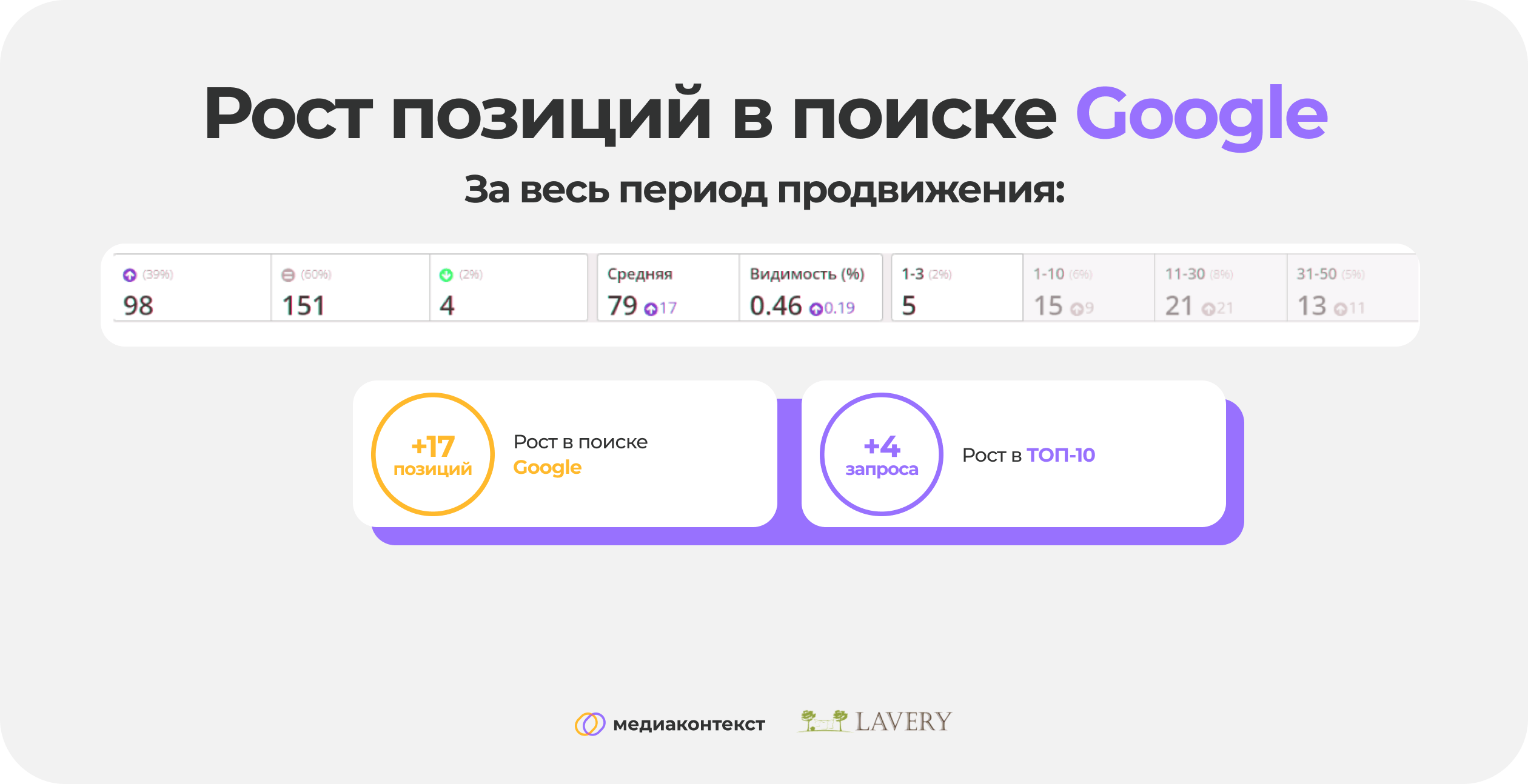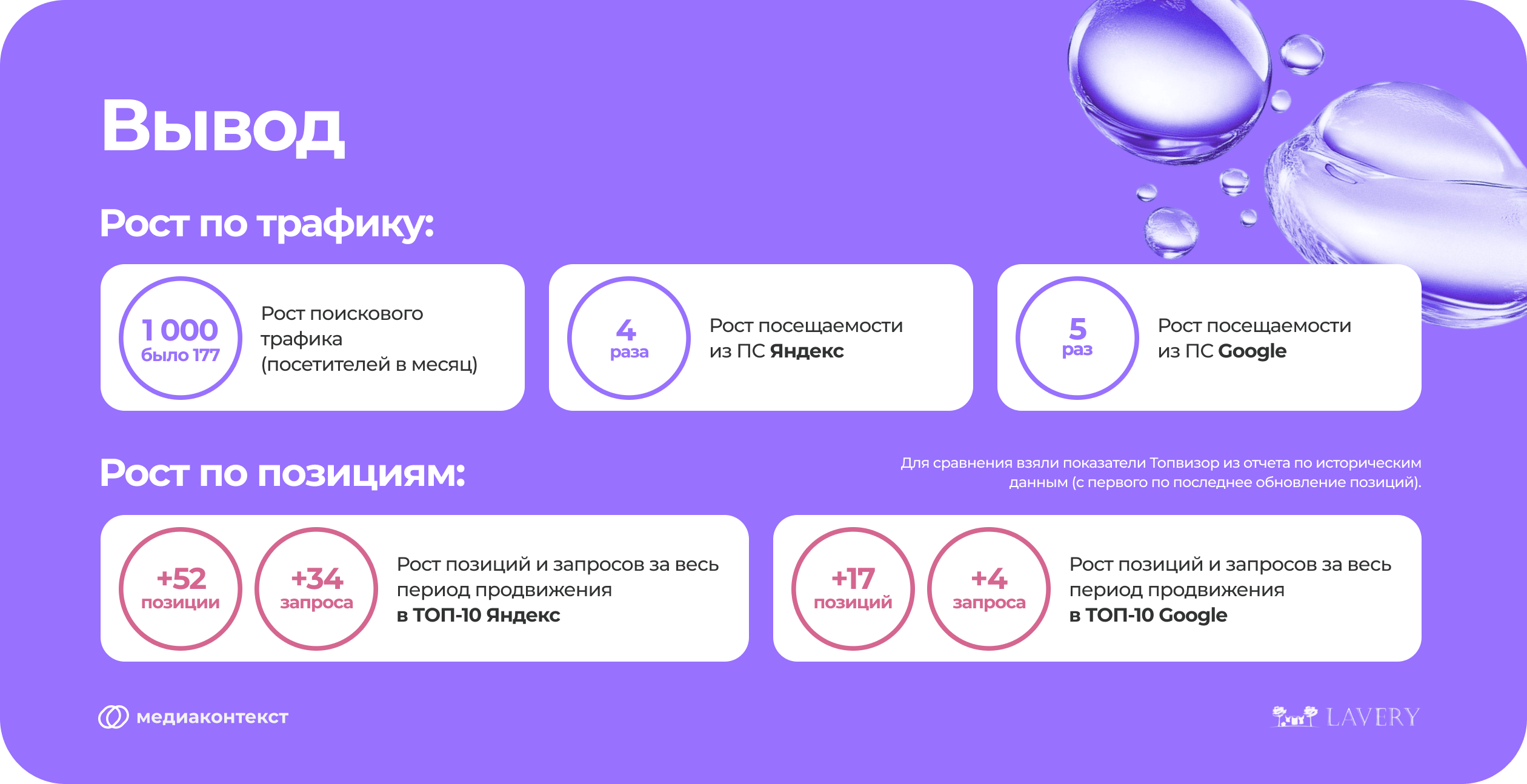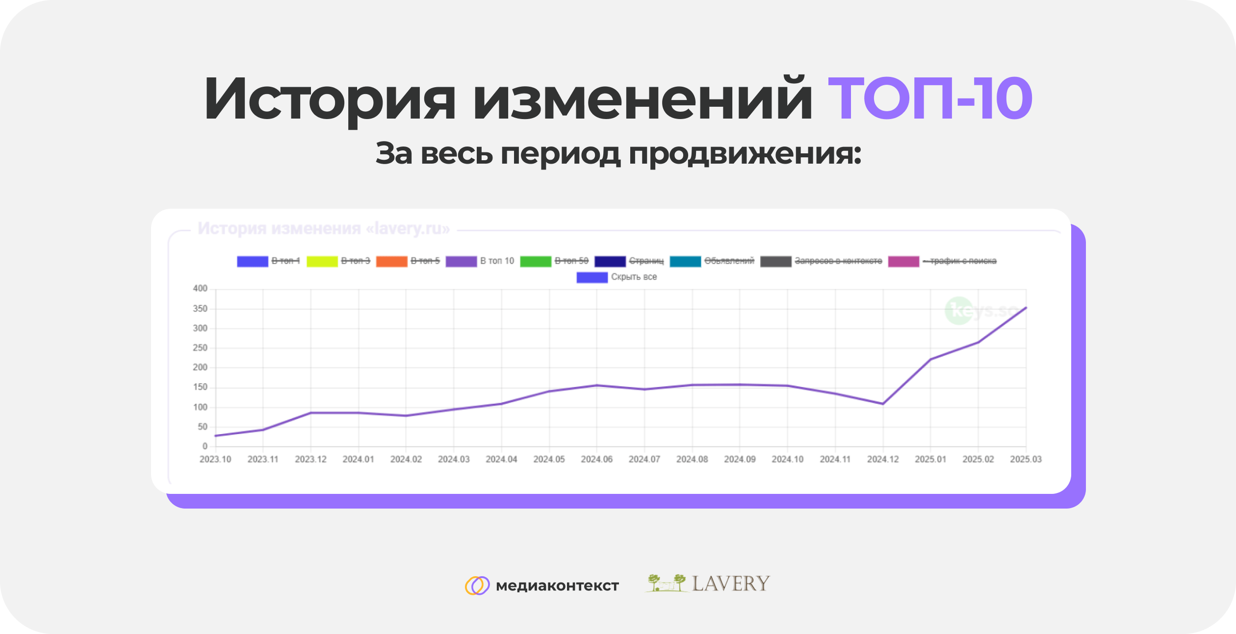 В этом кейсе представлены результаты продвижения в ТОП за год по ключевым запросам, а также увеличение органического трафика.