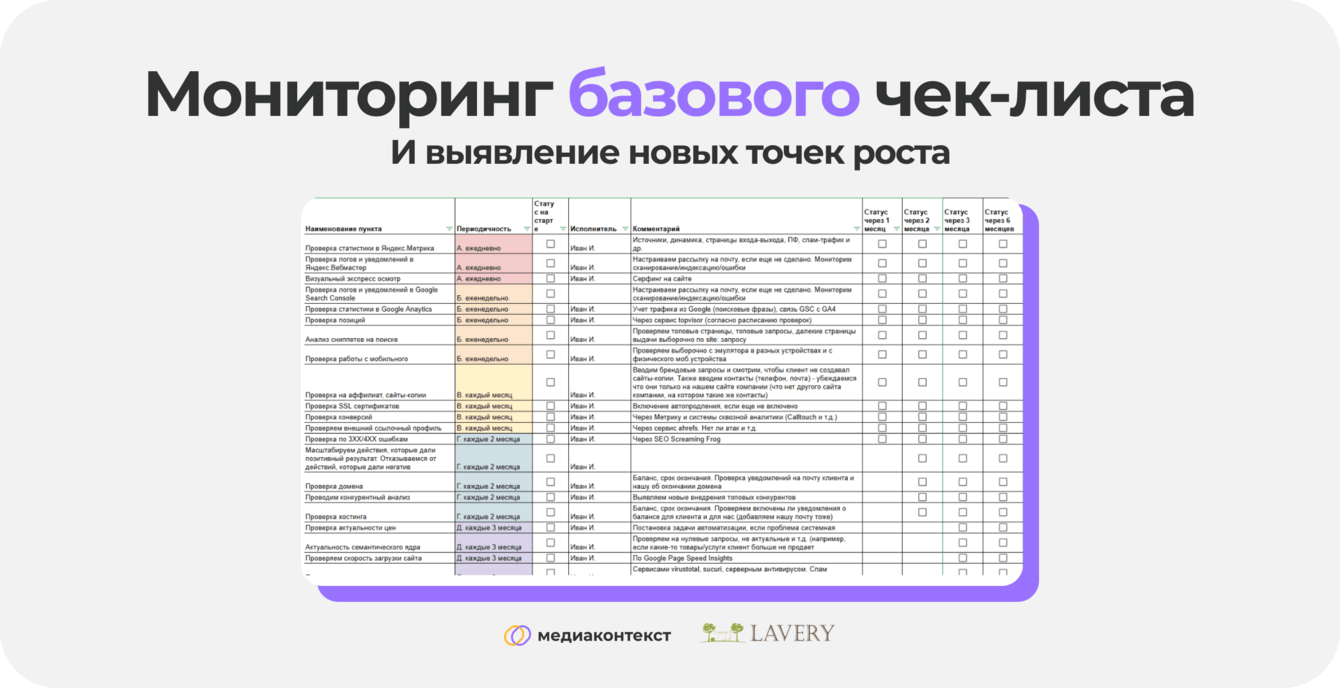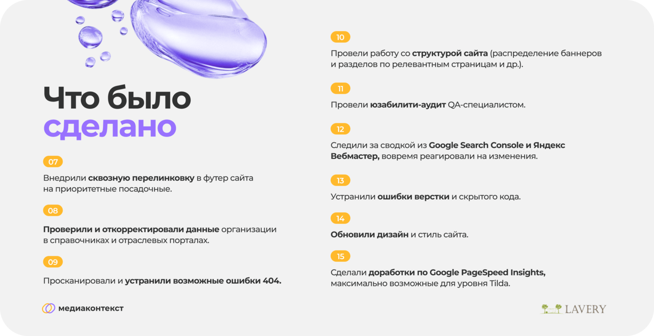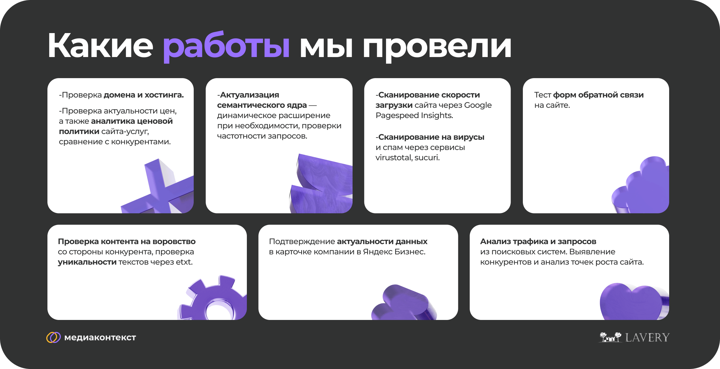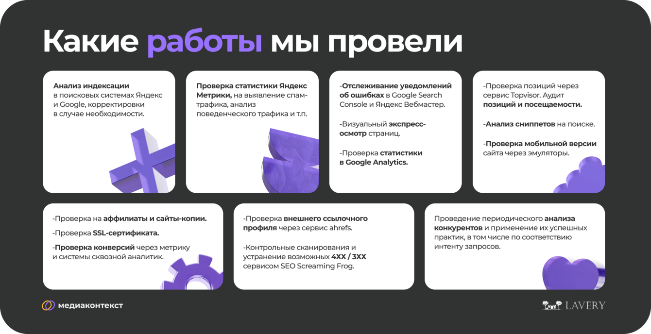 Перед началом работ мы выполнили полный SEO-аудит сайта. Диагностика была проведена вручную, с использованием различных сервисов. Мы проанализировали внутренние и внешние технические проблемы, а также выполнили анализ конкурентов по ТОП-5 и поисковой выдаче и юзабилити-аудит десктопной и мобильной версий сайта.