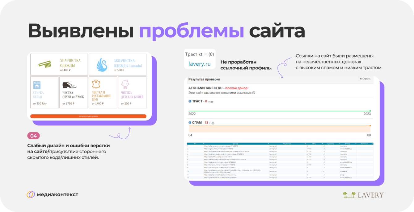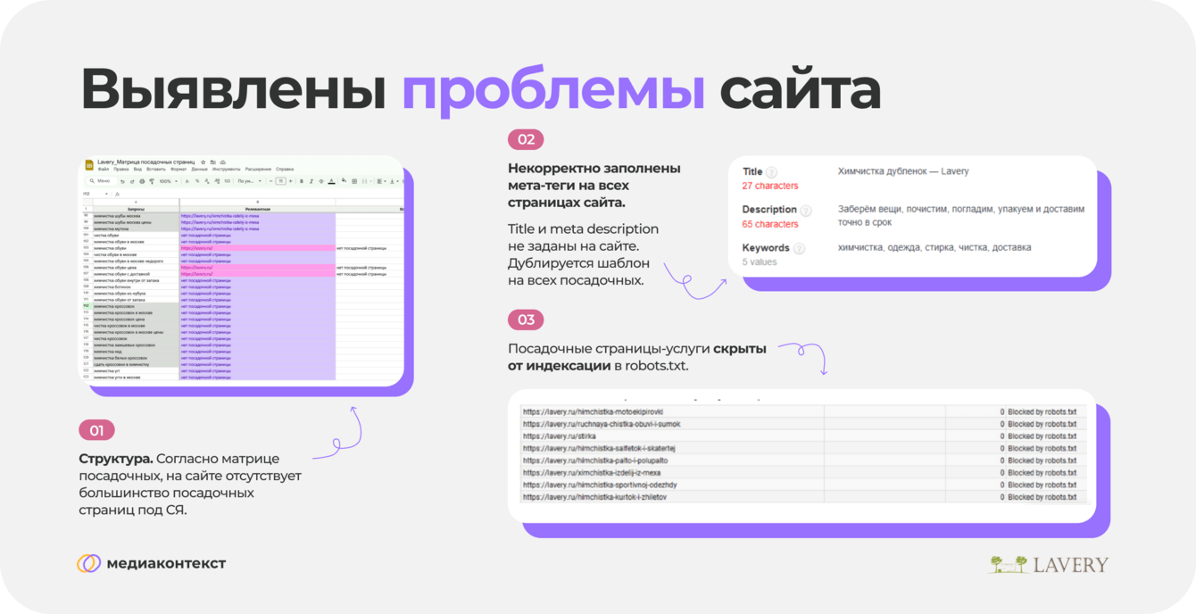 По результатам аудита и матрице посадочных страниц выявлены следующие глобальные проблемы: