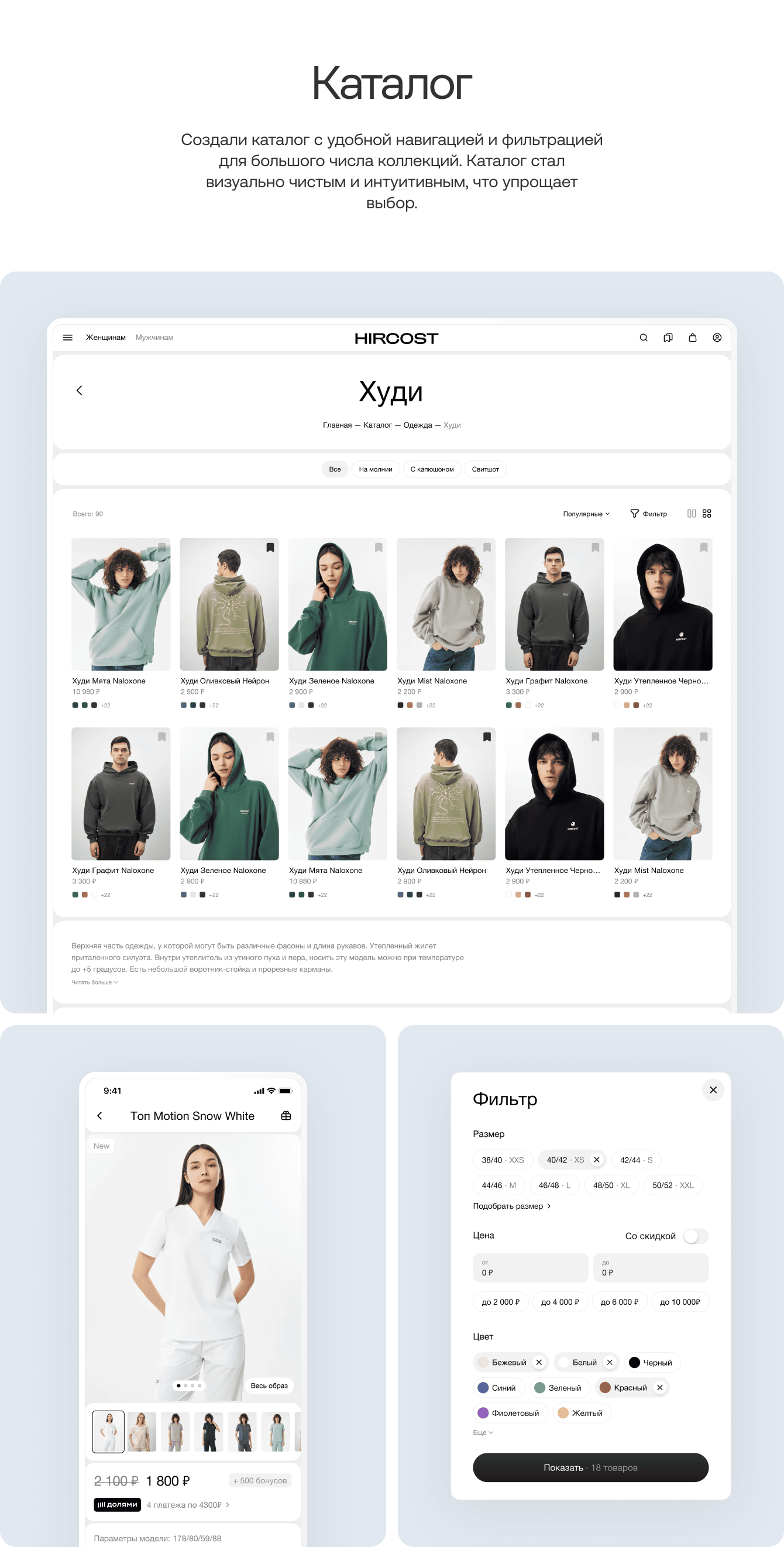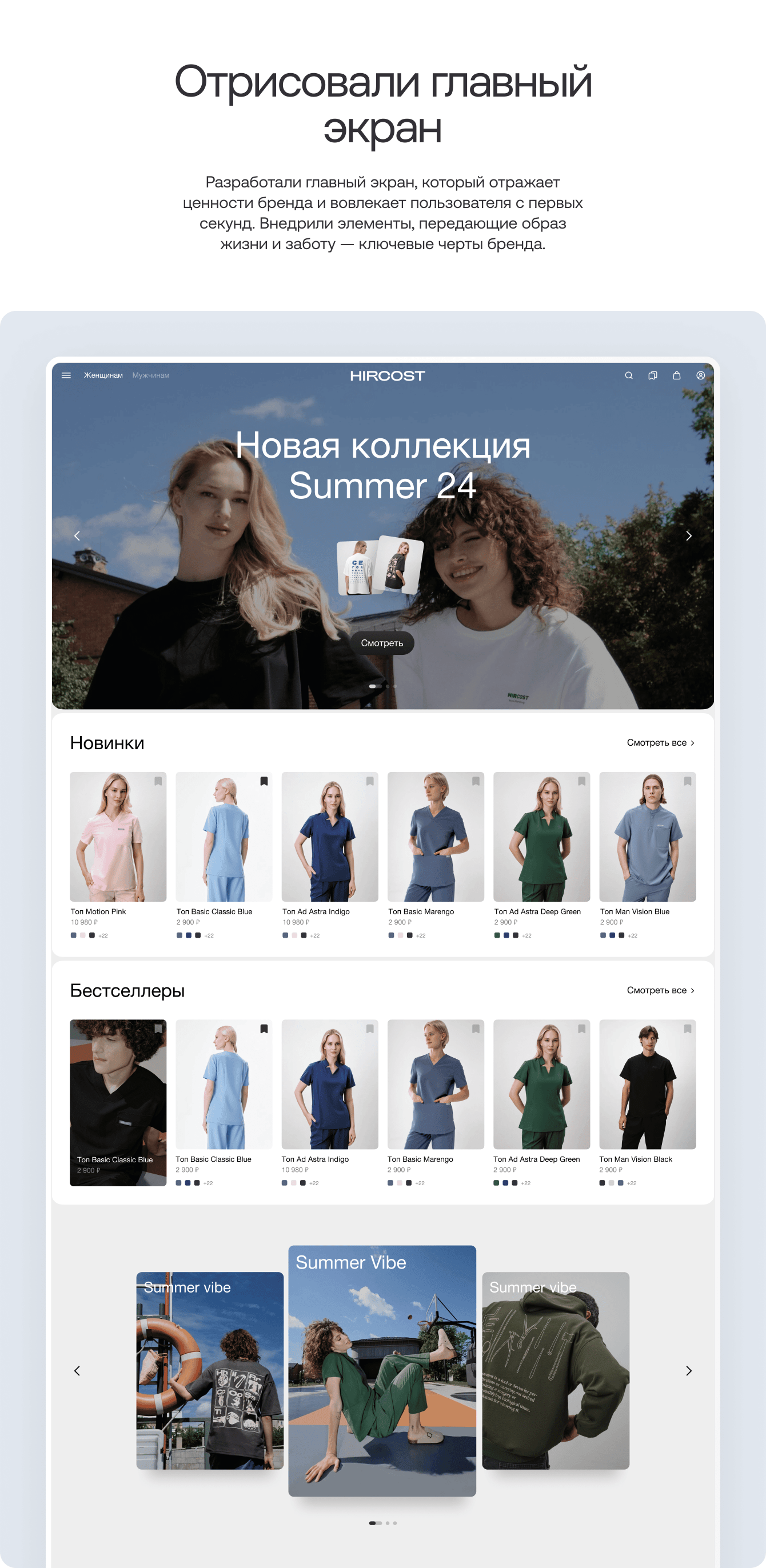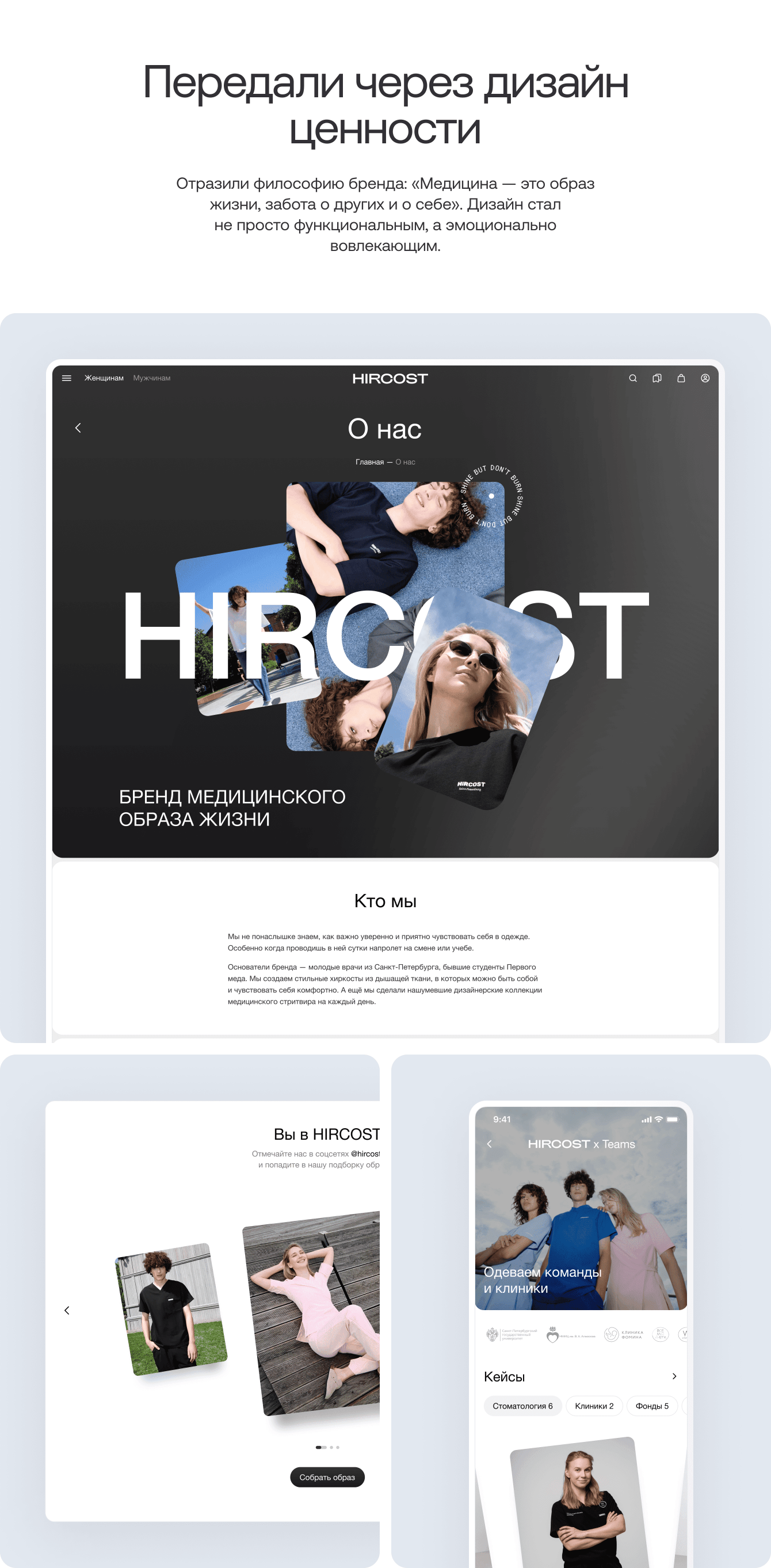 Hircost — крупный российский бренд медицинской одежды, создающий комфортные и стильные вещи для врачей и студентов медицинских вузов. Их предыдущий сайт был разработан на платформе Tilda, что накладывало ограничения на развитие функционала, сложные интеграции и кастомизацию. Цель проекта — обновить визуальный стиль, улучшить структуру сайта, разработать новый дизайн и перенести его на другую CMS.