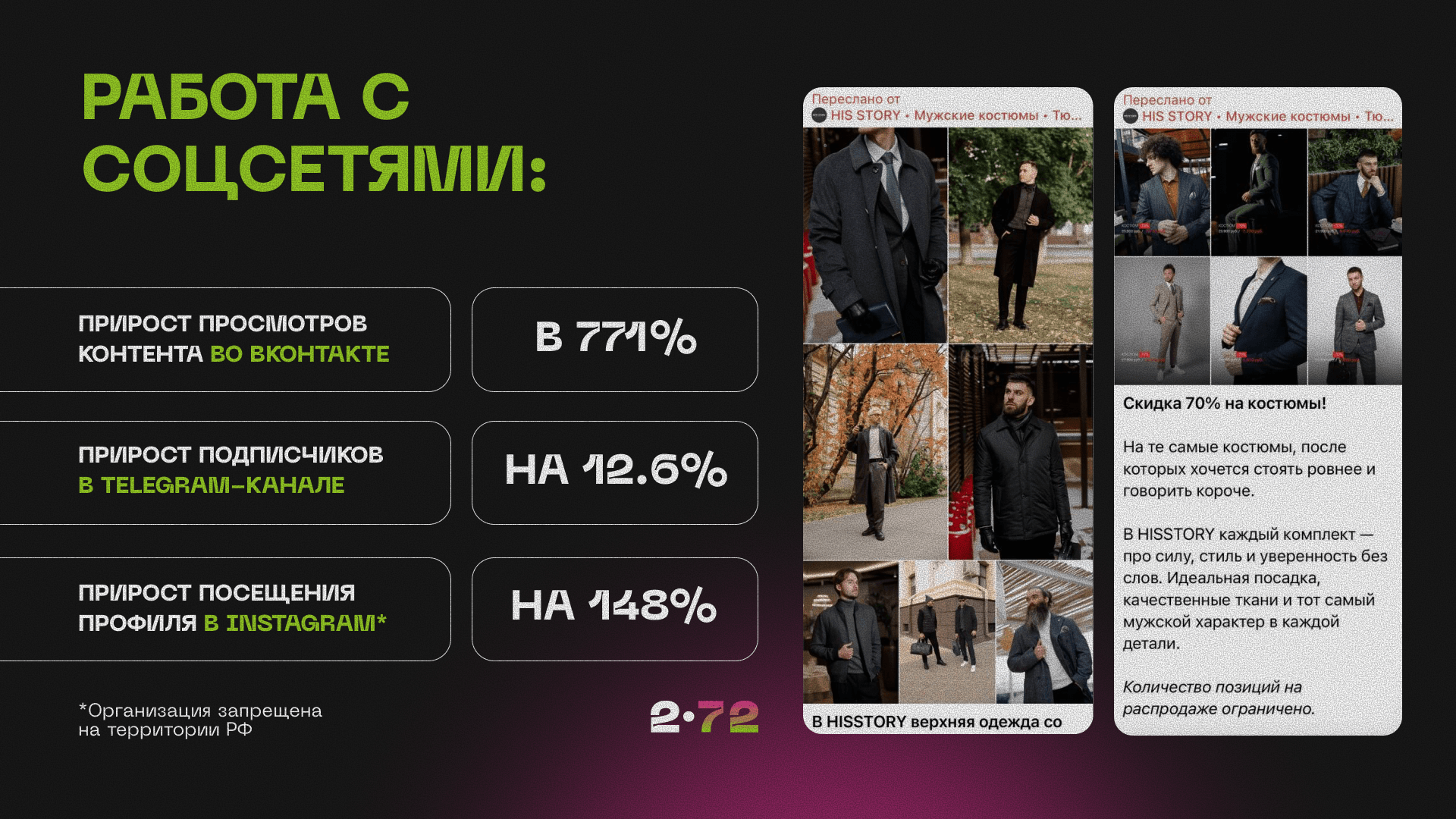 В рамках кейса HISSTORY мы полностью закрыли потребность в ведении социальных сетей, создавая уникальный контент для Telegram и адаптируя его под форматы Instagram* и ВКонтакте.