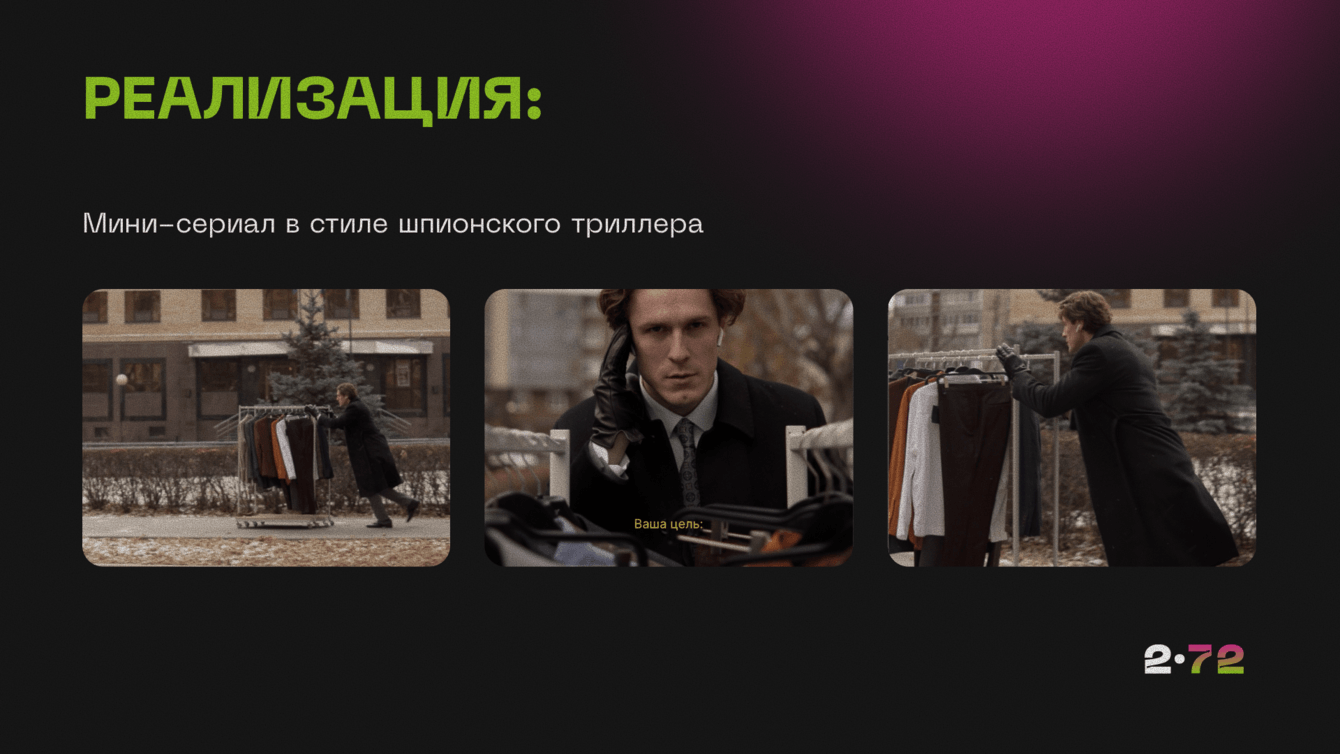 1. Сериал вместо рекламы. Мы сняли мини-сериал в стиле шпионского триллера. Сюжет: наш агент пытается доставить оранжевый iPhone 17 Pro в бутик к акции, а конкуренты всячески ему мешают. Каждый ролик заканчивался интригой, а образы героев были собраны из актуальной коллекции магазина.
