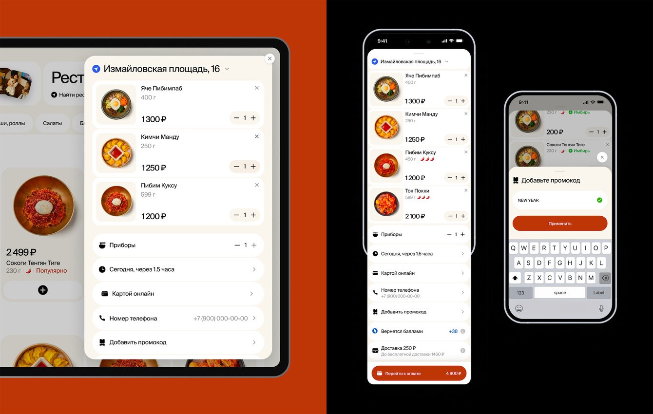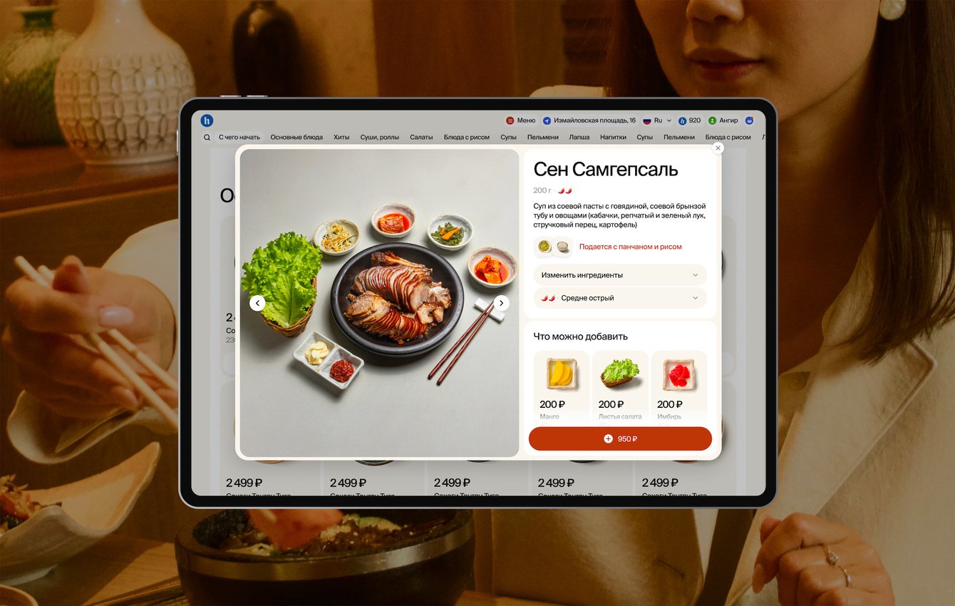 В них разместили карусель с фото, состав блюда, доступные добавки, пищевую ценность и степень остроты блюд (что особенно актуально для корейской кухни). Здесь пользователь может изменить специфические ингредиенты, такие как лук, чеснок, перец или кунжут, или снизить степень остроты блюда.