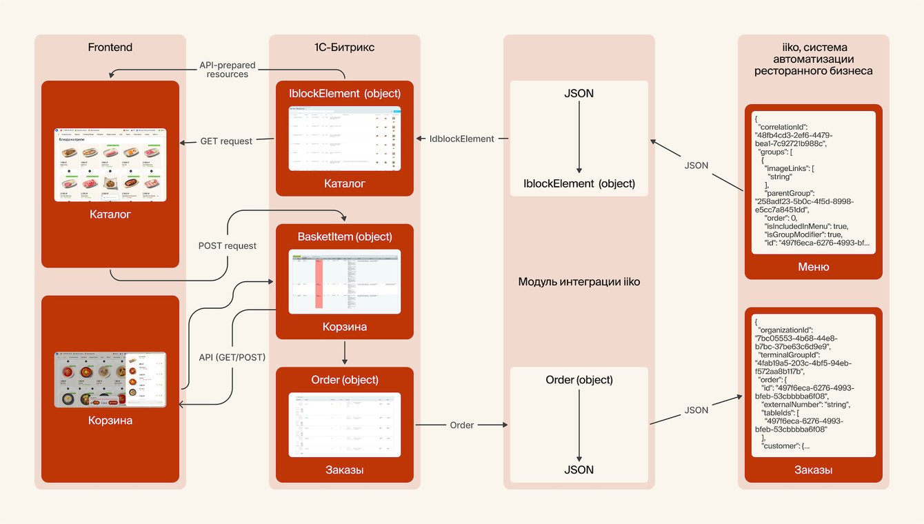 Для того, чтобы красиво выводить информацию из каталога в iiko на сайте, а затем правильно передавать в iiko заказы, мы проделали несколько интеграций и написали собственное API для 1С-Битрикс.