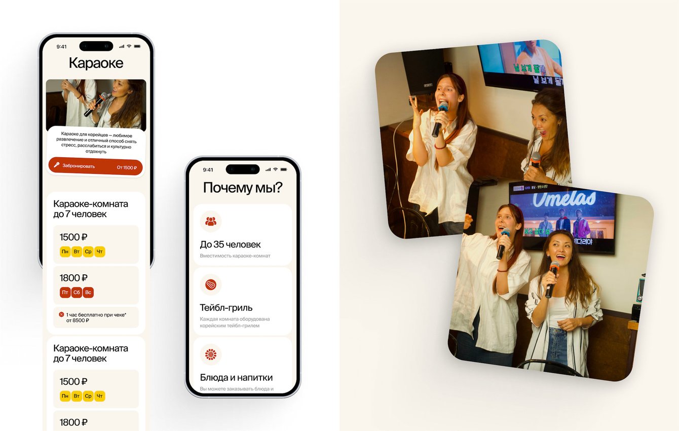 В одном из ресторанов сети Hite BBQ есть зал для корейского караоке — и многие посетители приходят сюда семьями именно ради атмосферы этой активности. Так что мы решили рассказать об этом УТП ресторана и на сайте — сделали отдельную страницу с полным описанием услуги и возможностью забронировать зал. На все страницы добавили яркие изображения и легкую анимацию, которая привлекает внимание посетителей.