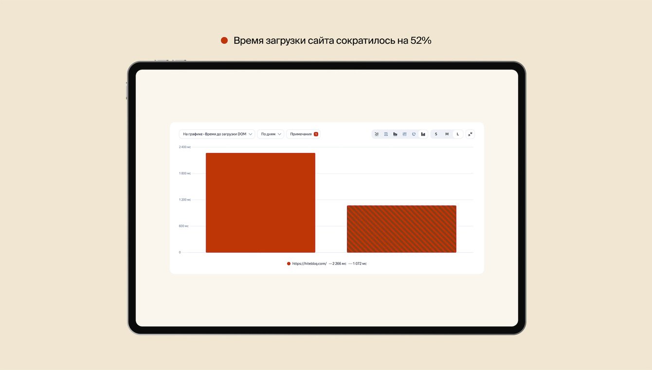 ✔️ Время загрузки сайта сократилось на 52%. Сайт Hite BBQ загружается всего 300 мс — это быстрее, чем сайты мировых HoReCa-лидеров вроде Dominos Pizza (600 мс), McDonalds (800 мс) и Delivery Club (900 мс).