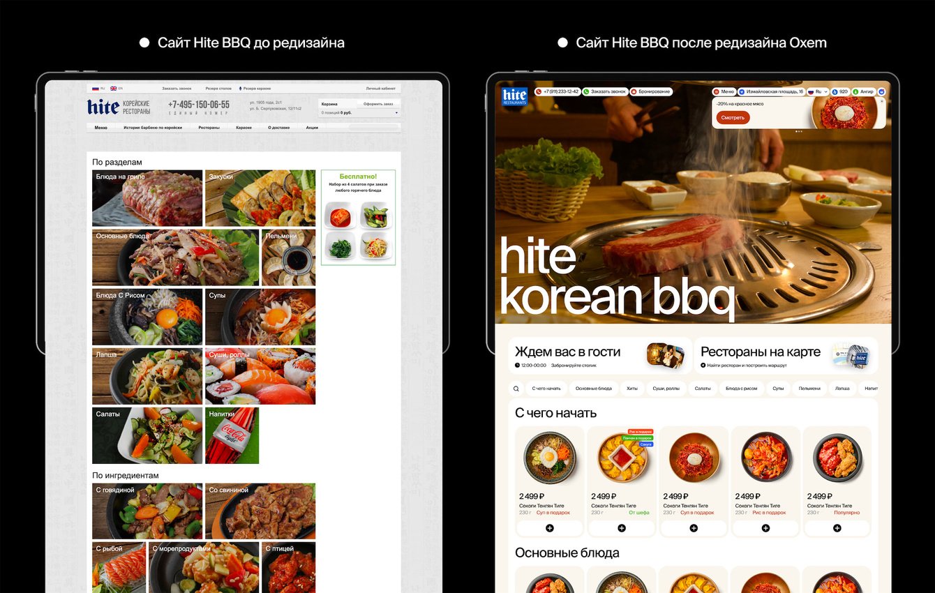Несмотря на лидерство ресторана в офлайне, сайт Hite BBQ сильно проигрывал конкурентам в онлайне. Устаревший UI, сложный каталог блюд и неудобное оформление доставки не соответствовали уровню заведения. Поэтому коллеги из Hite BBQ обратились к Oxem за помощью — организовать удобный процесс заказа блюд, обновить дизайн и сделать сайт соответствующим статусу топового ресторана корейской кухни Москвы.