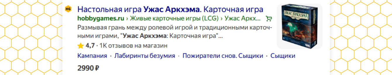⬆️ Так выглядит расширенный сниппет в выдаче «Яндекса» по запросу «hobby games ужас аркхэма»