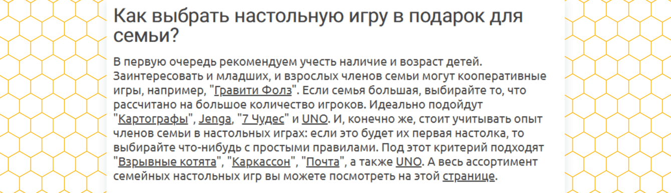 ⬆️ Пример перелинковки в статье «20 лучших настольных игр для всей семьи», написанной по нашему ТЗ. Статья набрала более 87 400 просмотров