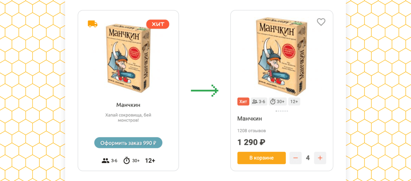 ⬆️ Вид карточки товара до и после. Также настроили возможность добавлять в корзину несколько одинаковых товаров и добавили отображение количества отзывов для каждого товара