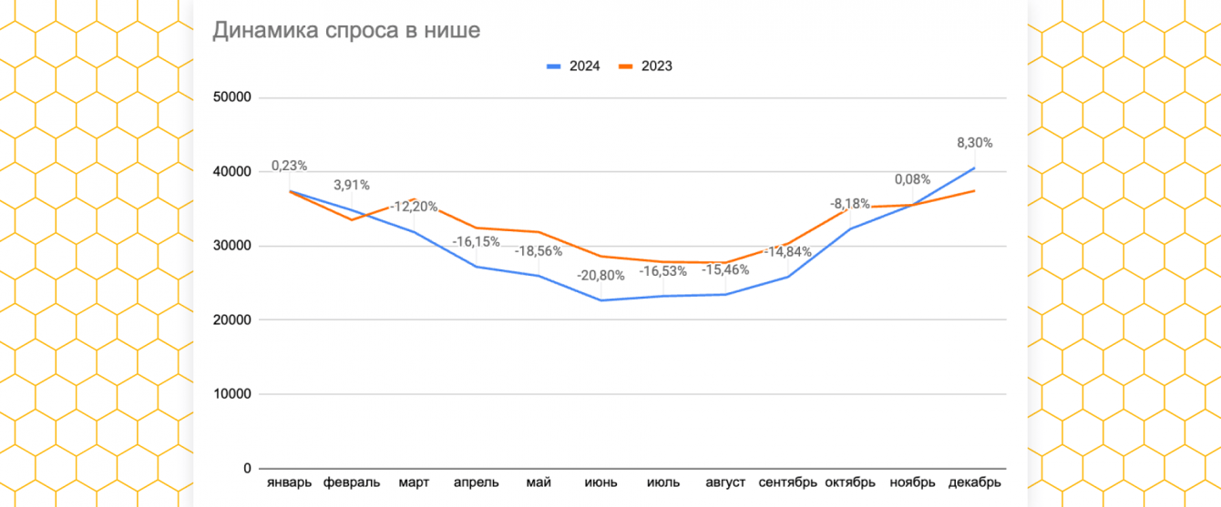 Динамика спроса в нише в 2023–2024 гг. Спрос на настольные игры подвержен сезонности: наибольший рост отмечается в декабре, а наименьшие показатели — с марта по июль