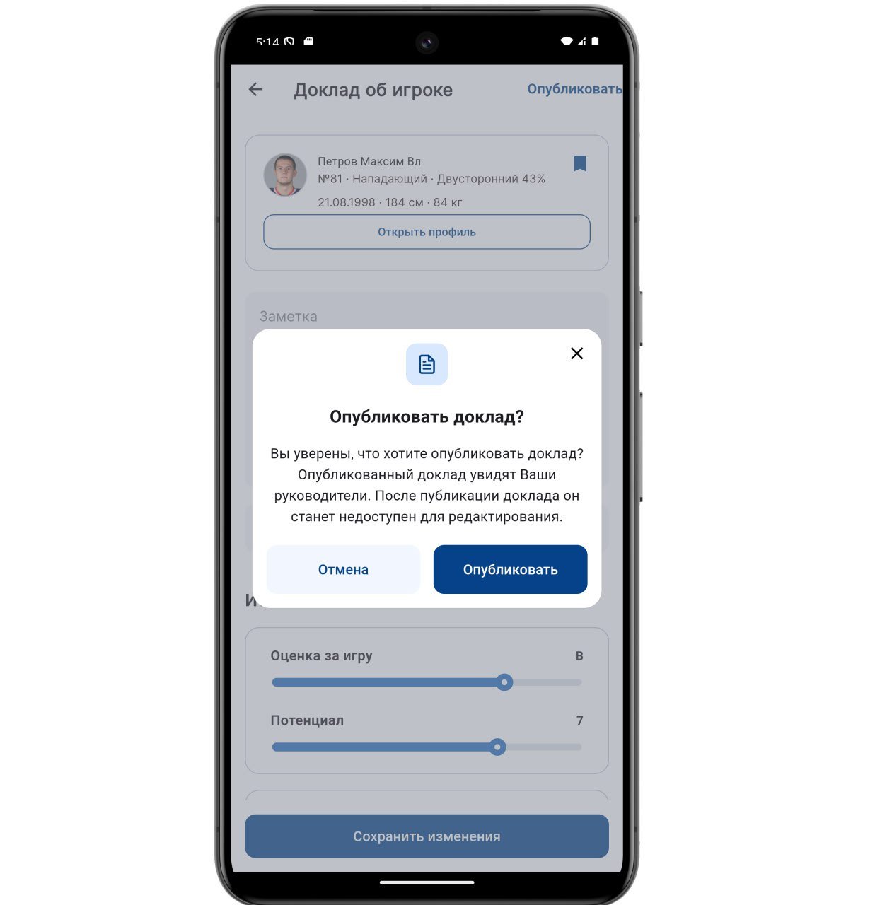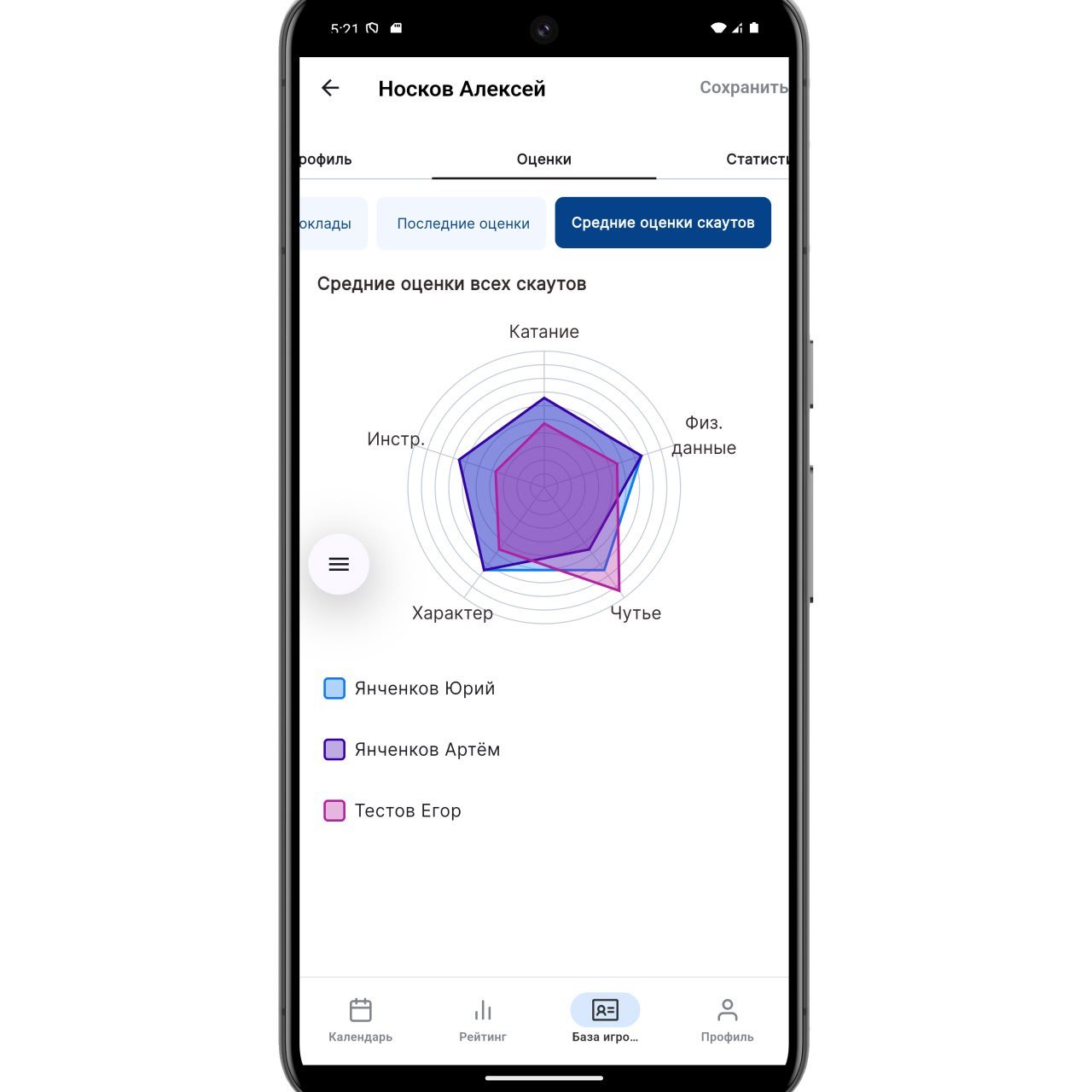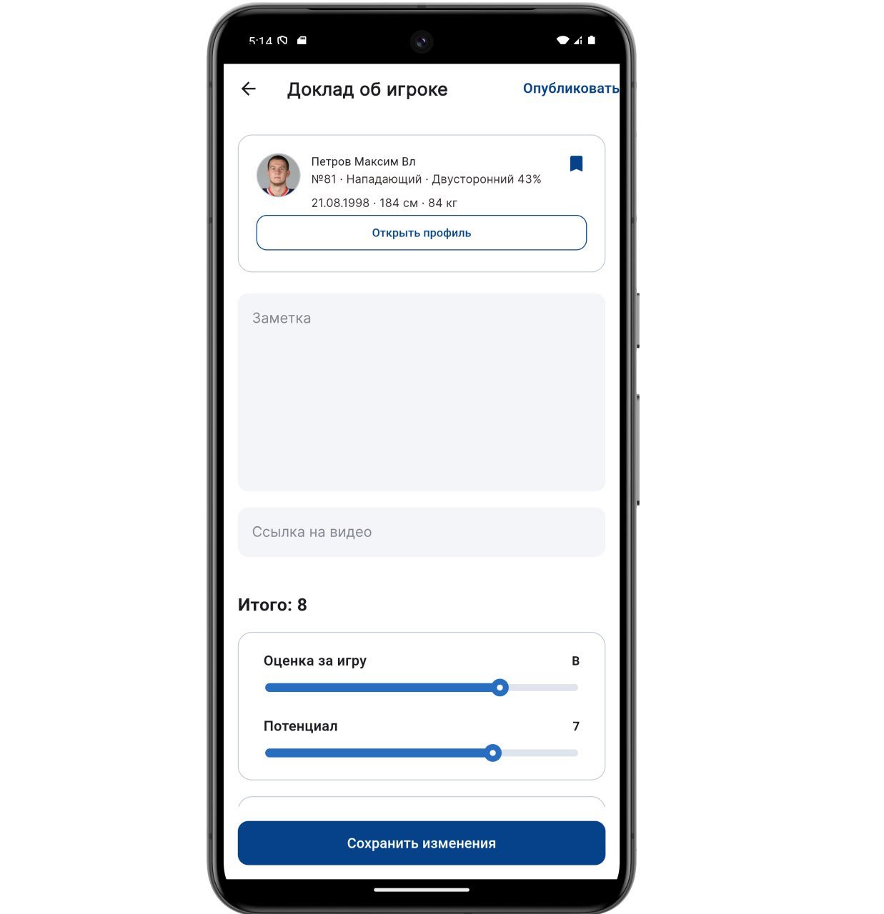 Приложение предоставляет удобный доступ к профилям игроков и сбору детализированных отчётов об их игре в матчах, облегчает обработку статистики и повышает точность данных. Использование интуитивных слайдеров для выставления оценок прямо во время игры позволяет скаутам оперативно фиксировать наблюдения, не отвлекаясь от процесса. Это повышает эффективность сбора данных и качество анализа визуальной информации.