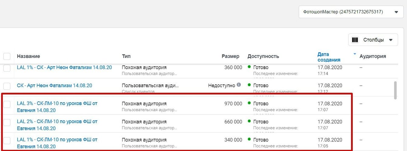 Их оказалось: 340 000, 660 000 и 970 000 человек. Ко всему этому, ранее клиенты скачивали прогревающие лид-магниты, чтобы заинтересовать курсом, поэтому данную базу дополнительно использовали и добавляли в каждой группе объявлений Look-a-like 1, 2 и 3%.