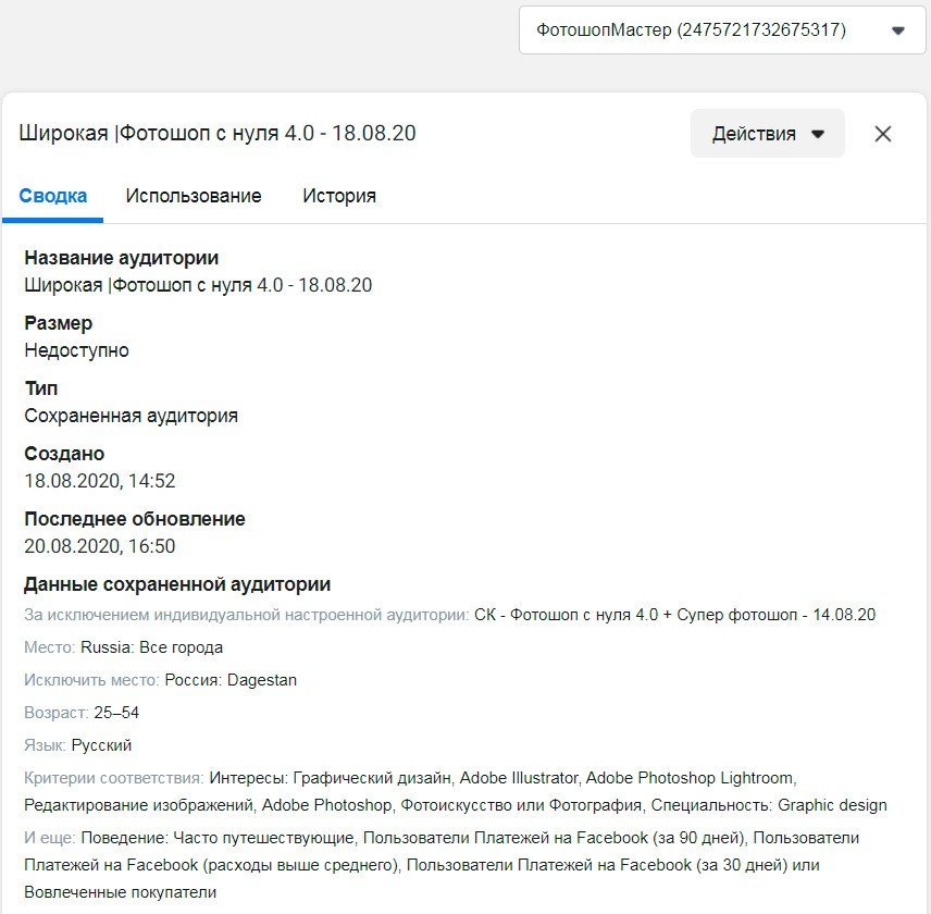 Дополнительно сделали широкую аудиторию (сохраненную), описав портрет клиента, выбирали критерии и интересы связанные с Adobe Photoshop + платежеспособную аудиорию.