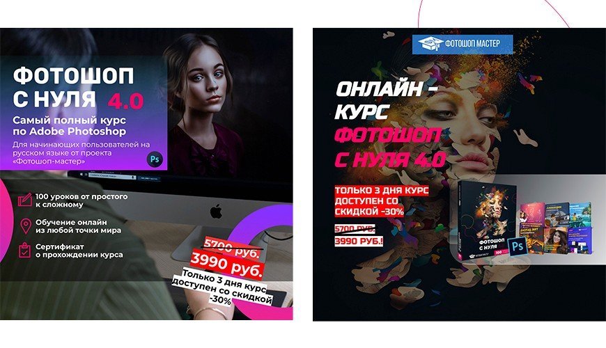 Потенциальный клиент видит рекламное объявление, с горячим предложением -30% на курс + «бонусные уроки в подарок», после переходит на основной лендинг с онлайн-курсом