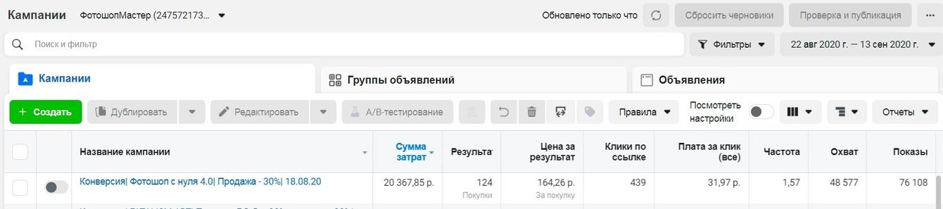- Были получены холодные продажи онлайн-курса «Фотошоп с нуля 4.0», на сумму +62 443 руб. за 16 дней с бюджетом 20 367, 85 руб.