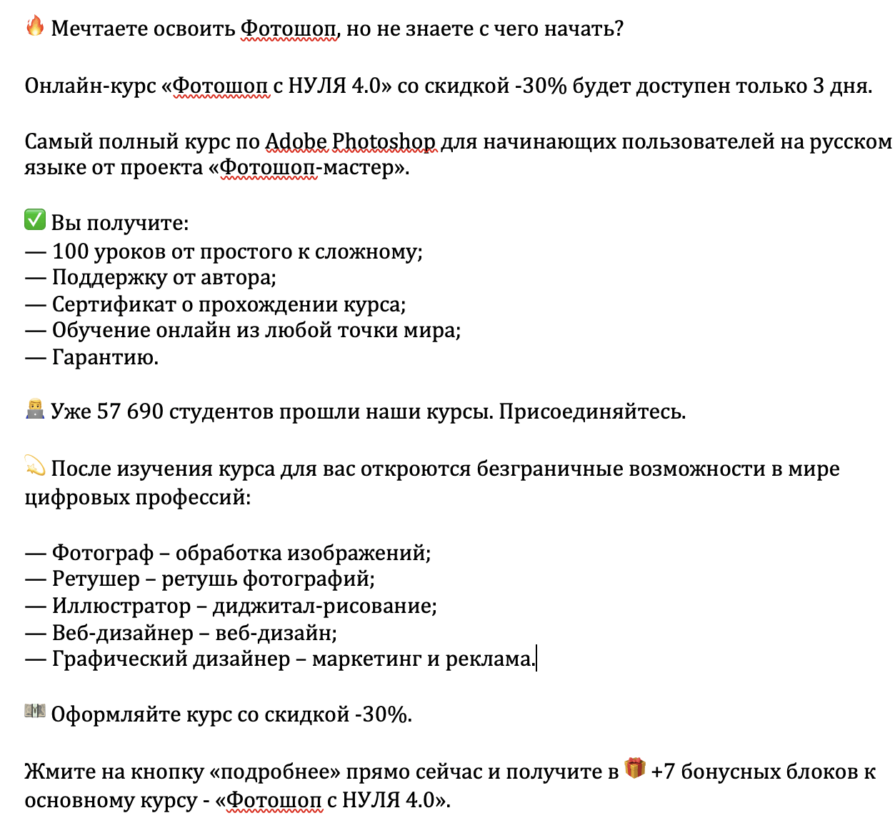 Для перехода на главный лендинг было создано 5 видео креативов адаптированных под ленту/сторис и написано 2 рекламных текста. Ниже несколько вариантов креативов и рекламный текст, которые работали и приносили результаты в виде оплат.
