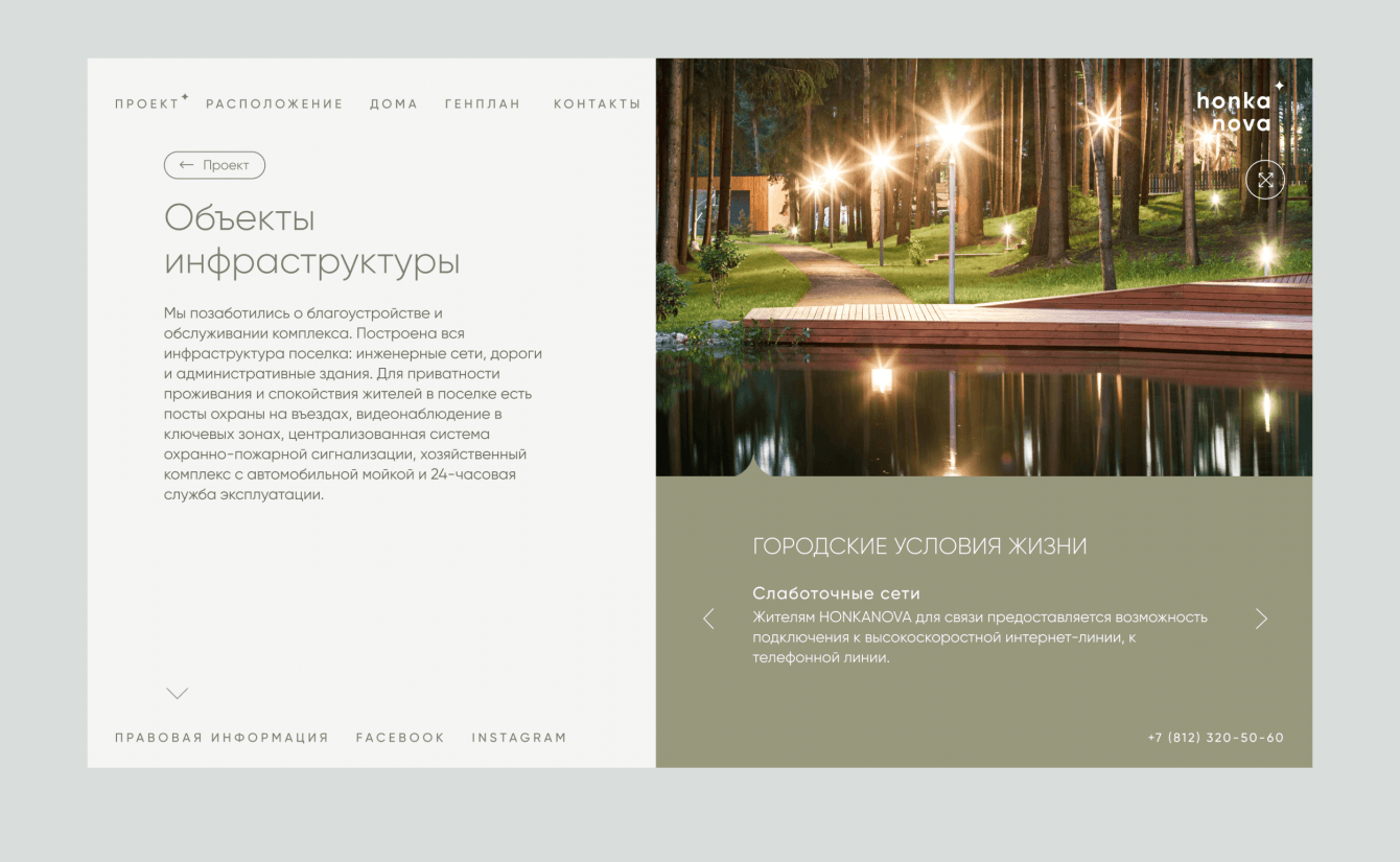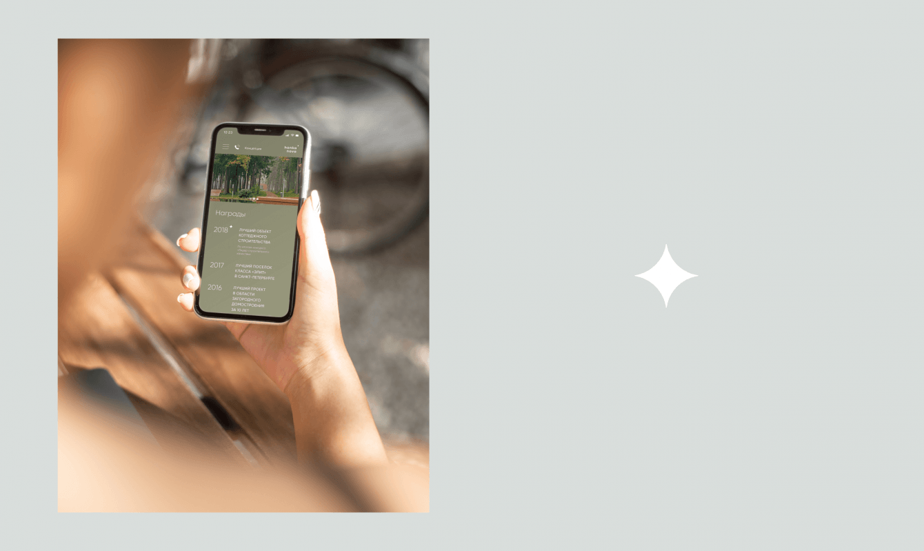 Главная задача — создать полное погружение в жизнь посёлка. В концепции сайта сделан акцент на эстетических и функциональных особенностях проекта. Красота в деталях.