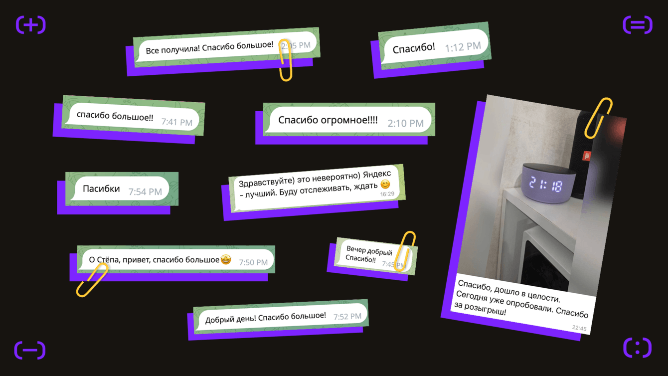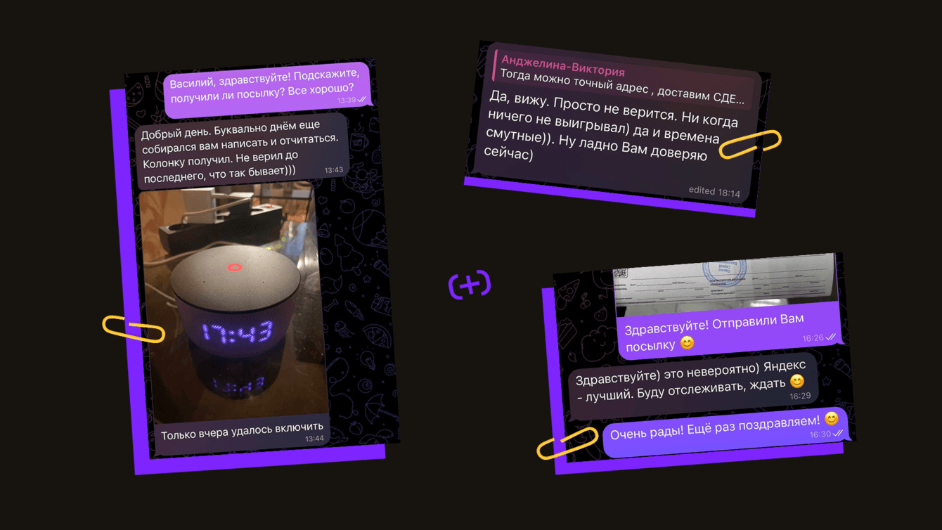 Особенно запомнился парень, который сомневался с первого сообщения. Когда мы написали ему, что он выиграл Яндекс Станцию, он сказал, что никогда в жизни ничего не выигрывал. Но всё-таки дал нам свой адрес и когда получил посылку, написал сообщение с благодарностью.