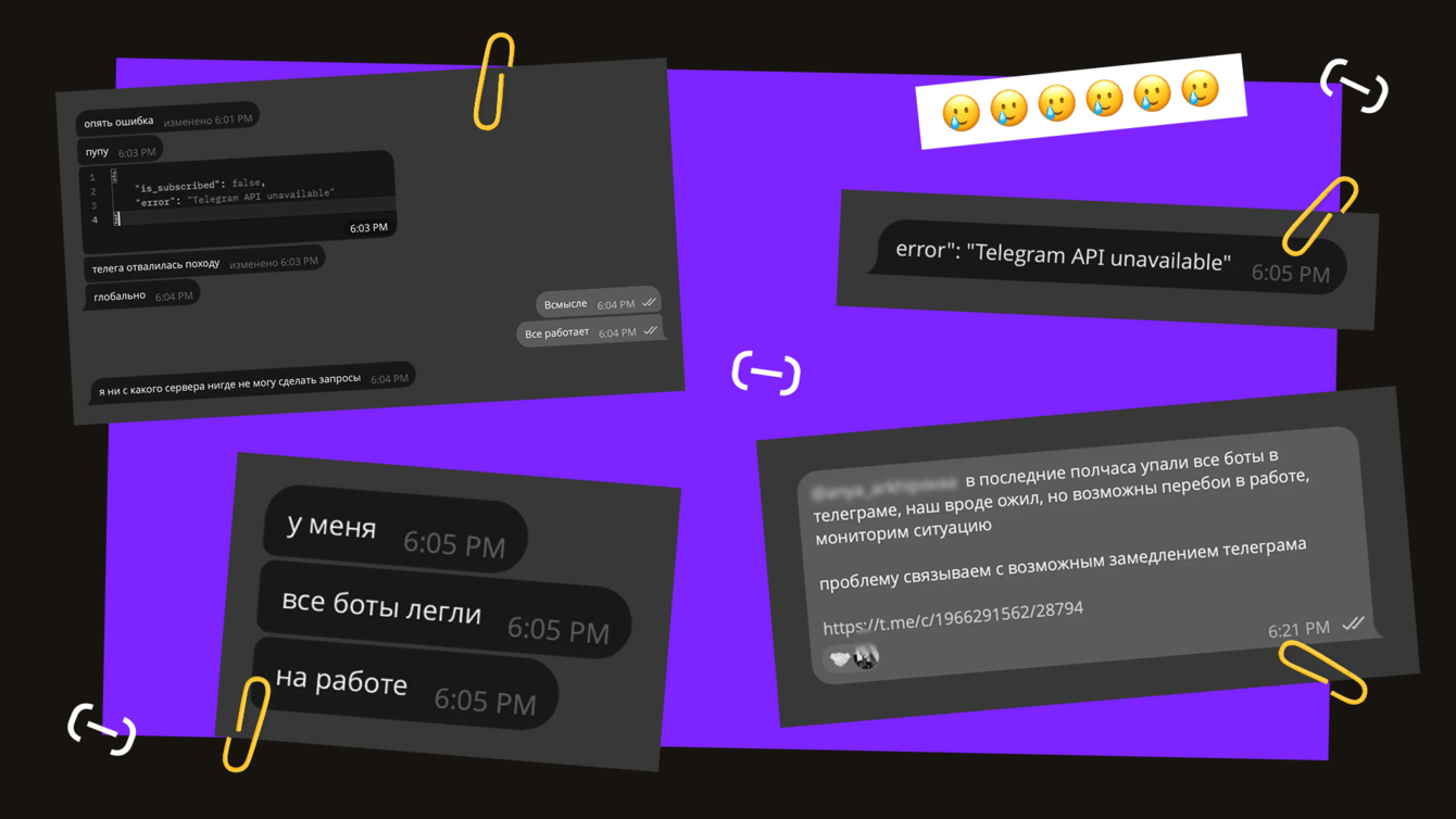 В этот момент мы всей командой ехали в метро на премию G8, в которой было номинировано наше агентство, и тут менеджеру проекта Степану приходит сообщение от разработчика: сервера Telegram массово упали, все мини-приложения не работают. Степан сразу же сообщил об этом клиенту. К счастью, серверы лежали всего около получаса, так что пока мы искали варианты, всё уже заработало.