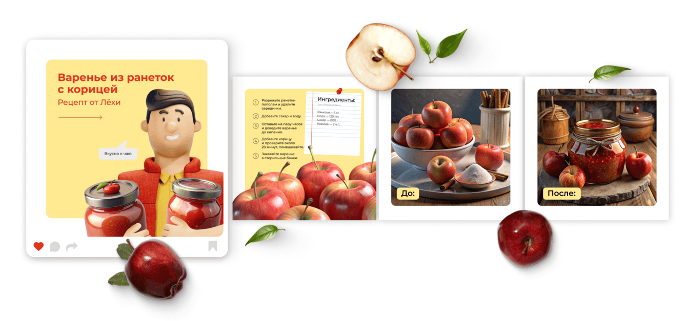 Крупные и сочные сгенерированные фото блюд визуально перекликаются с иллюстрациями из других карточек — получается цельная, узнаваемая подача. Такой контент не только стимулирует к покупке, но и мотивирует подписчиков готовить дома и разнообразить своё меню нашими идеями.