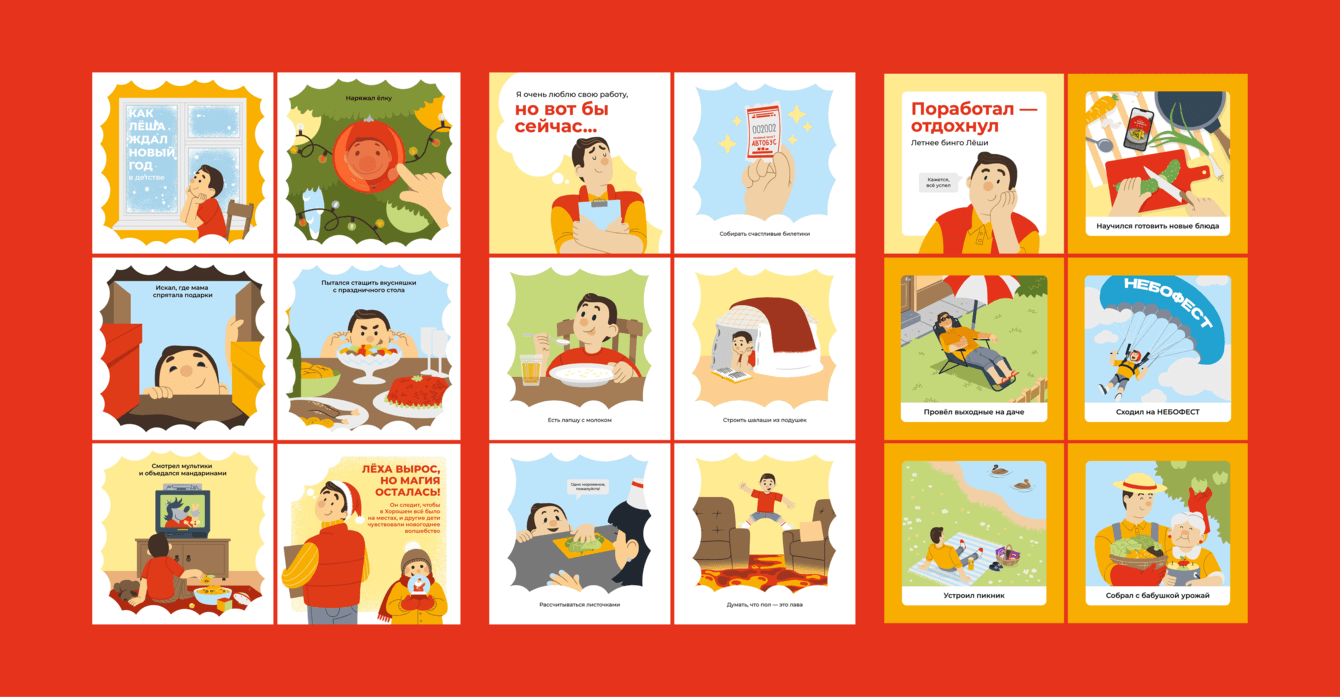 Лёша — живой и многогранный персонаж, который постоянно меняется. Мы разработали иконографию героя, адаптируя его внешний вид под разные ситуации — от праздничных поводов до бытовых сцен. Лёша не только органично вписался в коммуникацию с подписчиками, но и стал частью продающего контента.