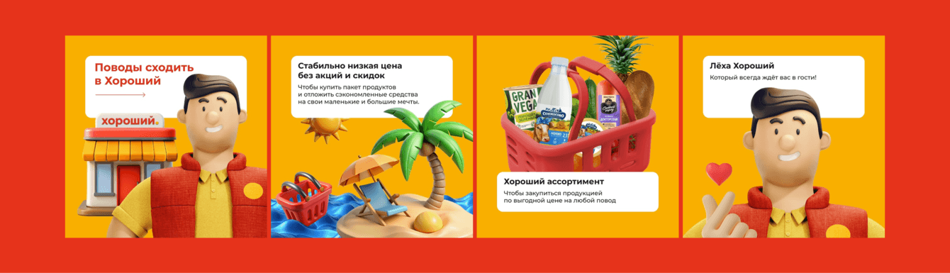 У дискаунтера уже был узнаваемый маскот — 3D-персонаж Лёша Хороший, которого покупатели знали по офлайн-коммуникации. Мы решили, что Лёша вполне готов к расширению полномочий, и вывели его в соцсети.