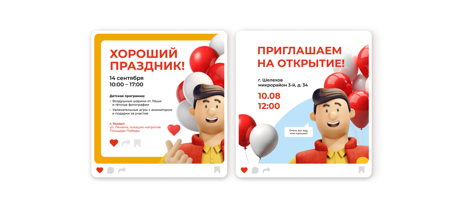 Мы рассказывали об открытиях, днях рождения и достижениях с помощью ярких макетов — с Лёшей, шарами и праздничным настроением, чтобы визуально и эмоционально выделить важные события.