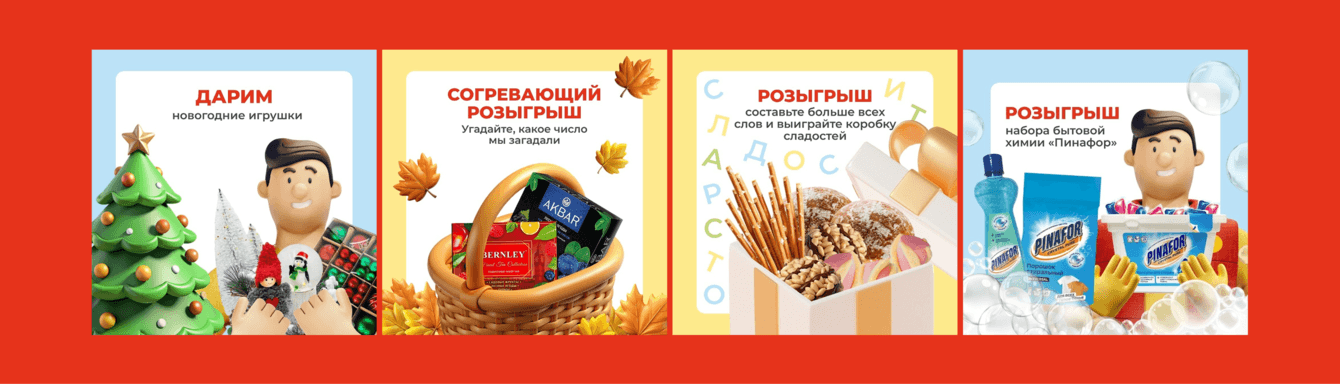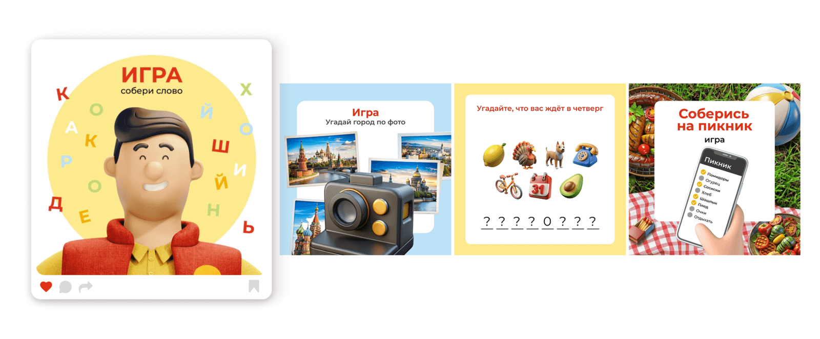 Добавили игры в карточках, тесты, опросы — они оживляют ленту и визуально выделяются. Такие посты не только отвлекают от потока ценников, но и создают эмоциональную привязку — подписчики начинают ассоциировать контент со своей повседневной жизнью и охотнее вступают в игру, комментируют и соревнуются друг с другом, повышая вовлечённость.