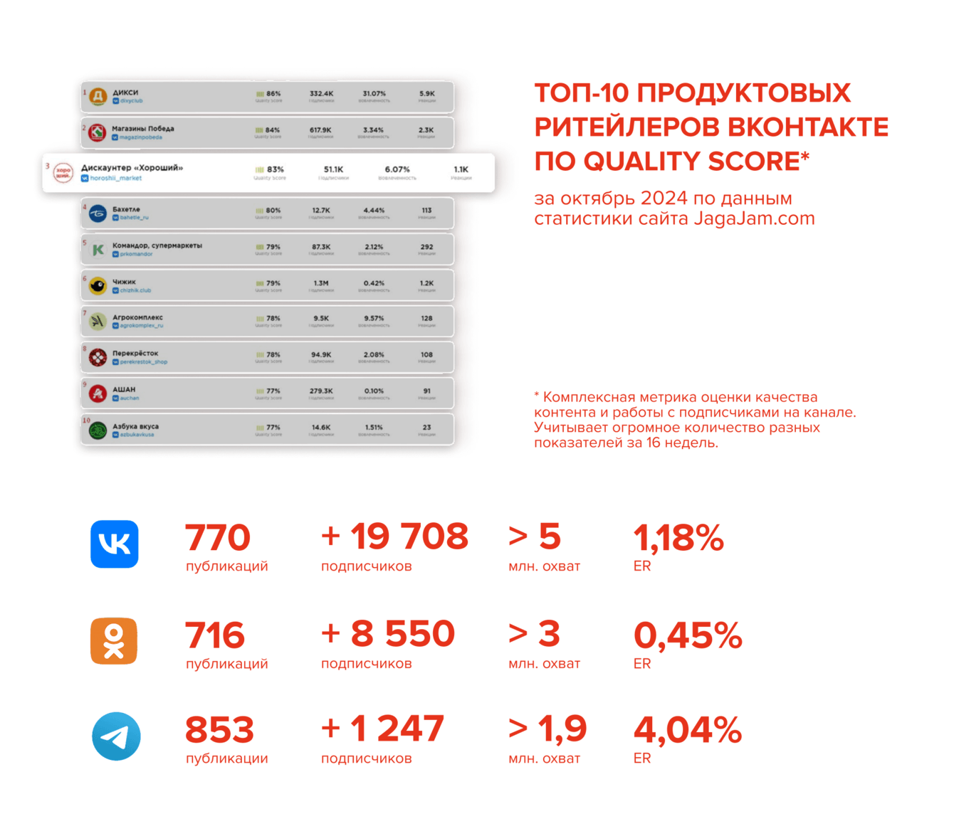 Агентство показало высокий уровень контента и внимательную работу с таргетом, а благодаря рекордному ER наш VK вошел в топ-3 среди ритейлеров в РФ по версии JagaJam. Это точно достижение года!