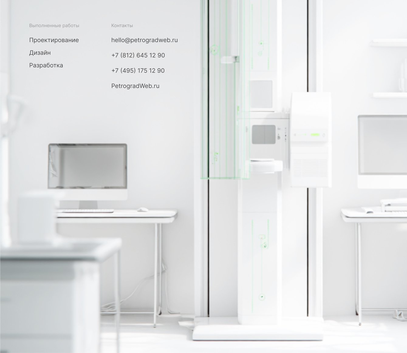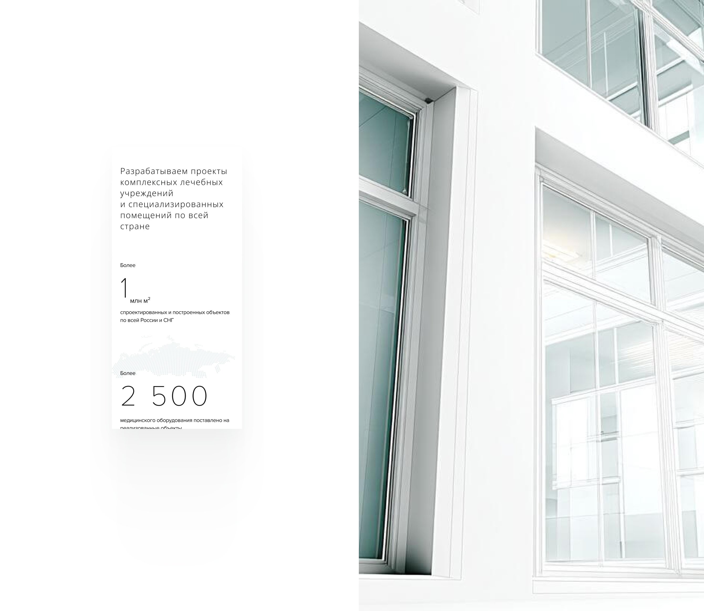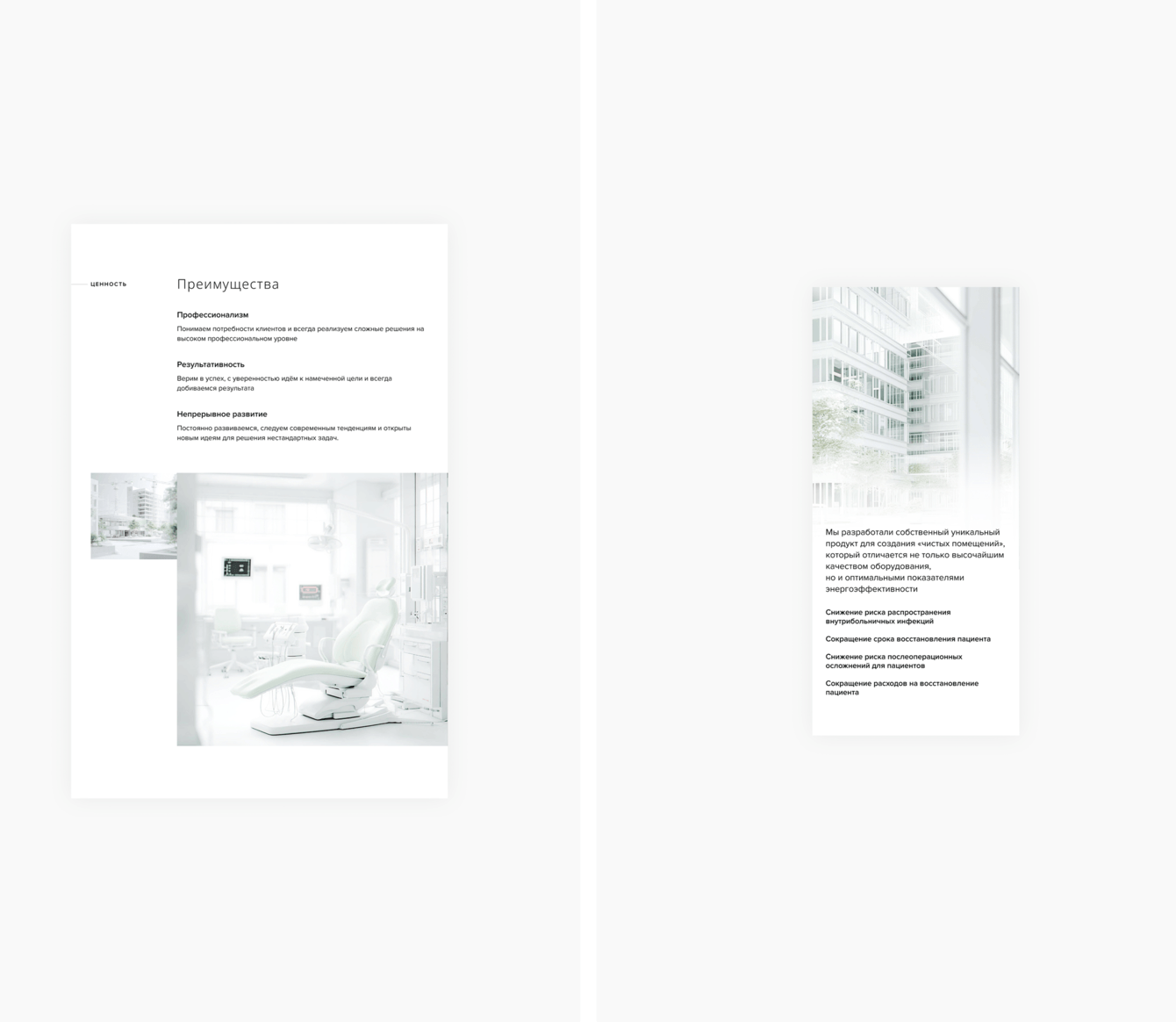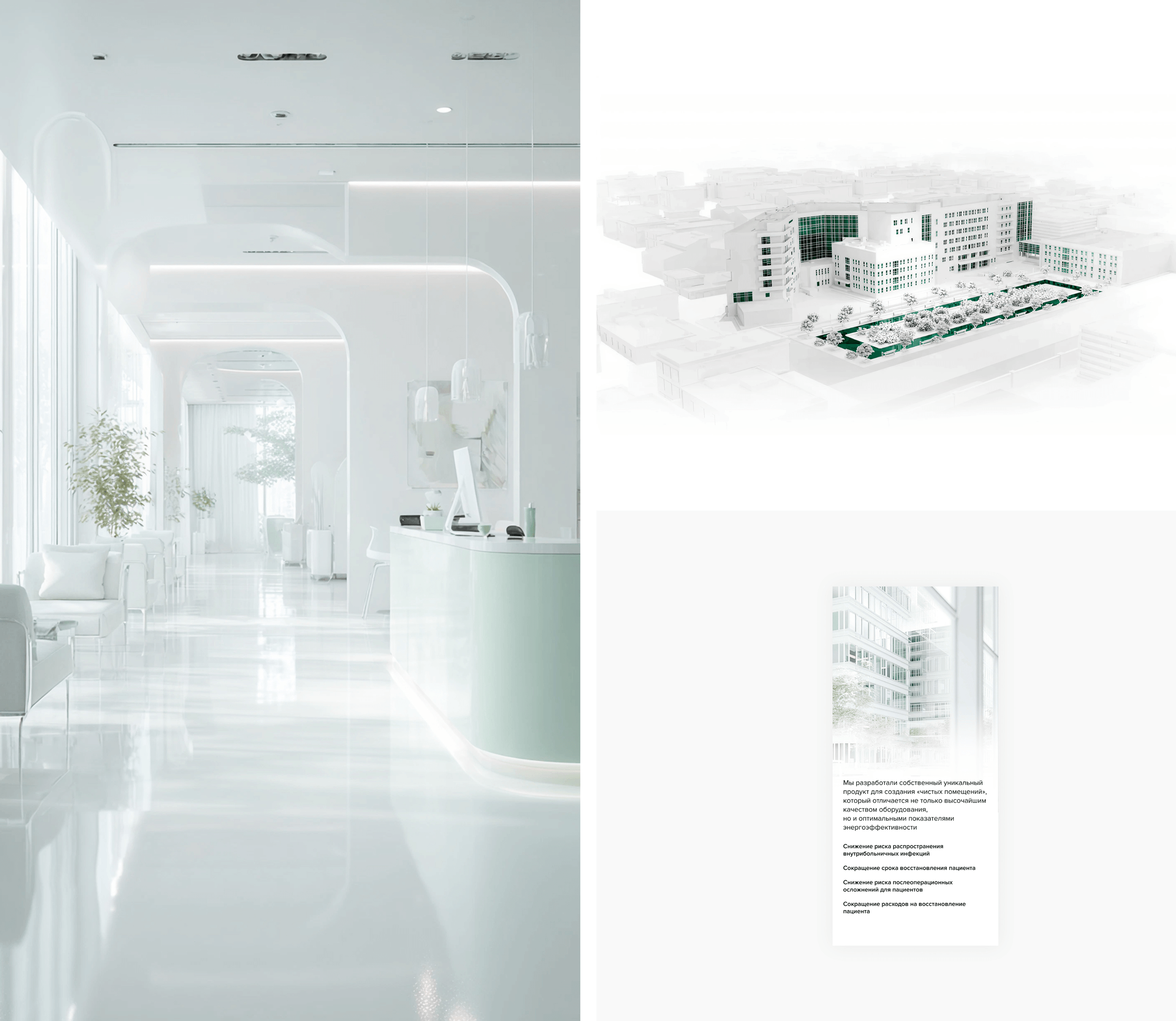 ● делает визуальный акцент на ценностях и ключевой компетенции – чистых комнатах и высокотехнологичных медицинских объектах;