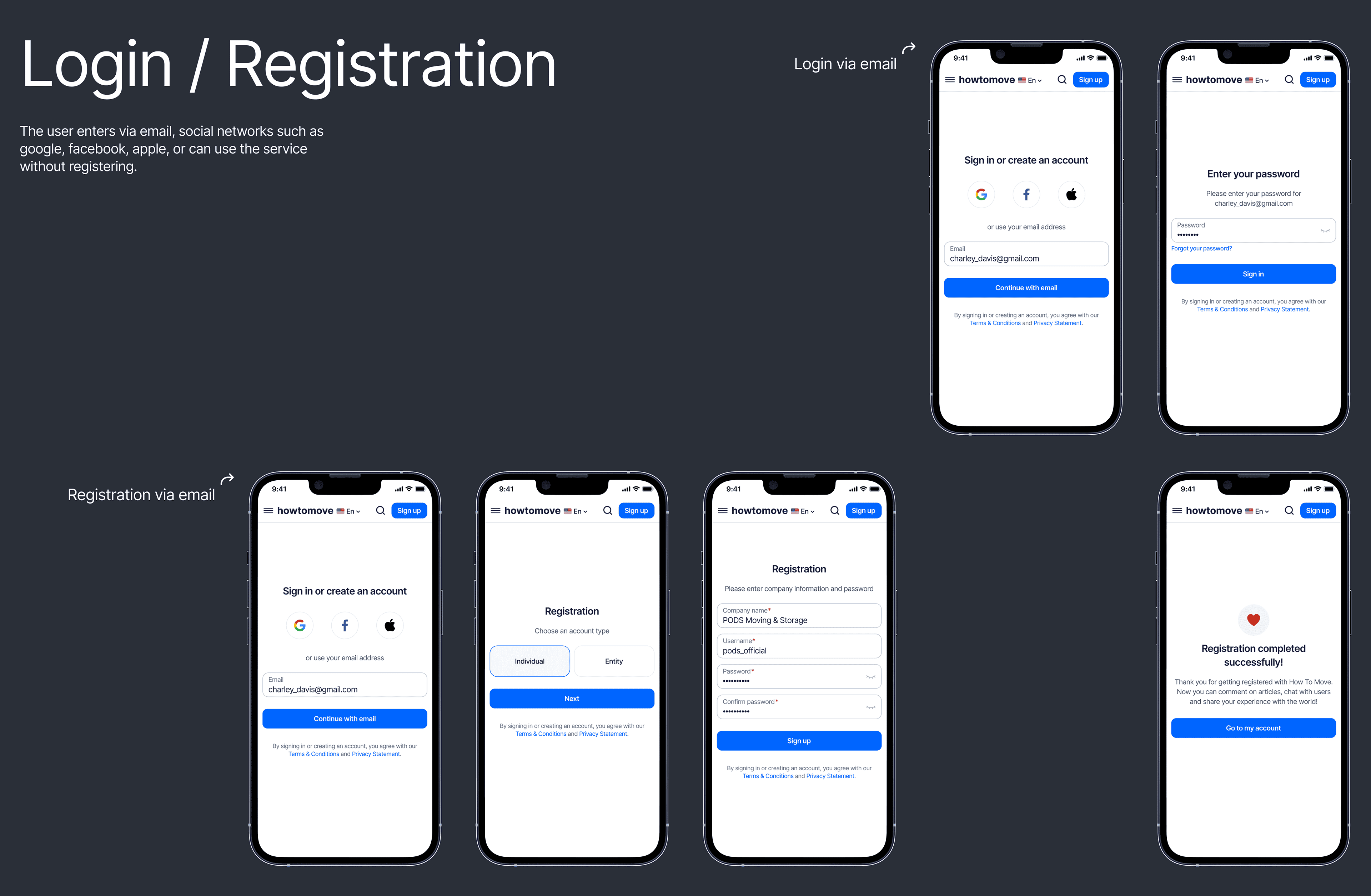 На платформе пользователи могут войти или зарегистрироваться с помощью email, а также через Google, Facebook или Apple. Регистрация проходит в несколько шагов: выбор типа аккаунта, ввод данных и пароля — после чего создается профиль с возможностью сразу начать взаимодействие с платформой.