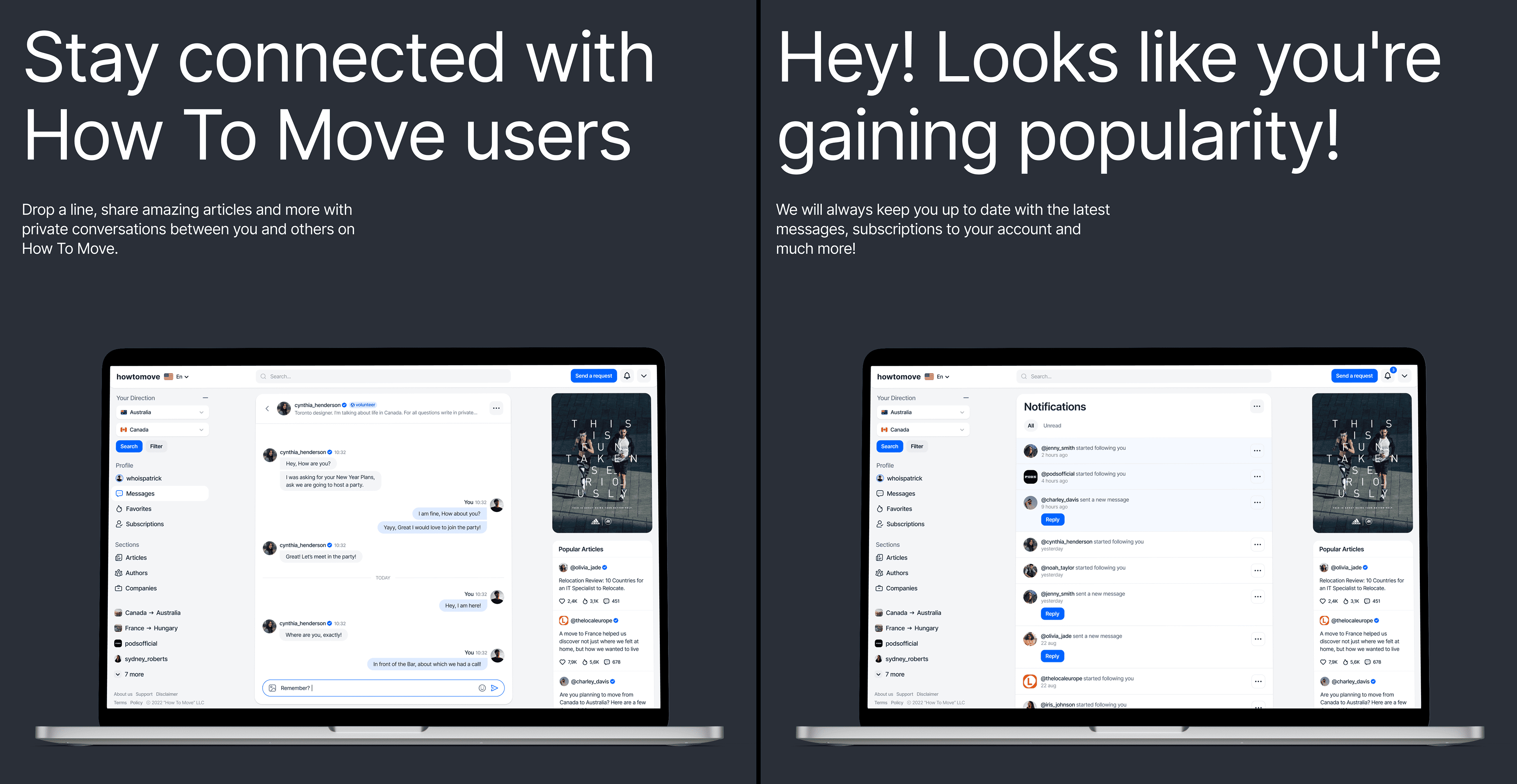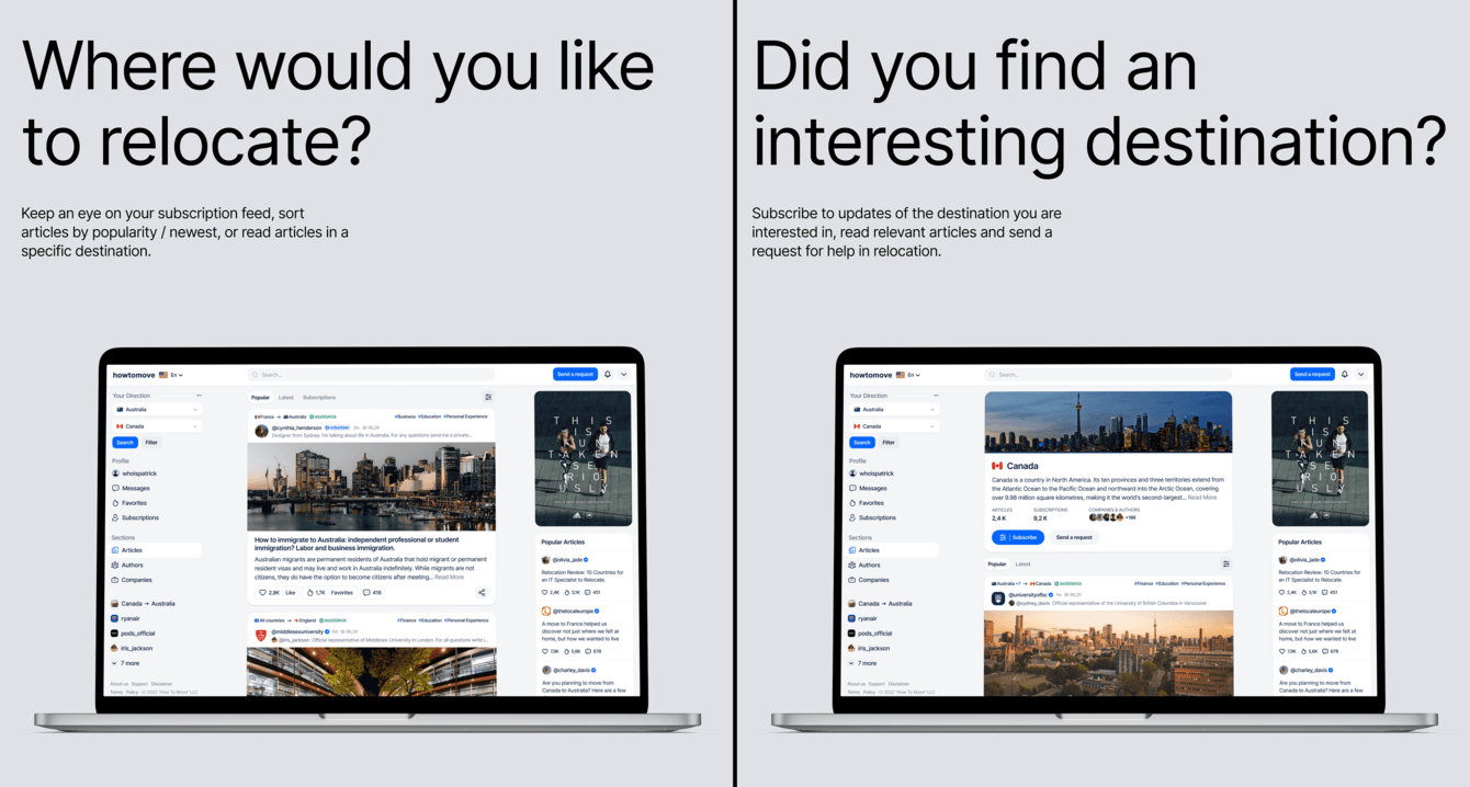 На этапе UX/UI-дизайна мы сосредоточились на создании понятного и дружелюбного интерфейса, отражающего миссию How to Move — облегчить переезд и адаптацию по всему миру. Мы избегали перегрузки и сделали ставку на контент: статьи, советы и запросы на помощь выходят на первый план благодаря лаконичной типографике, сбалансированной сетке и нейтральной цветовой гамме, не отвлекающей от главного.