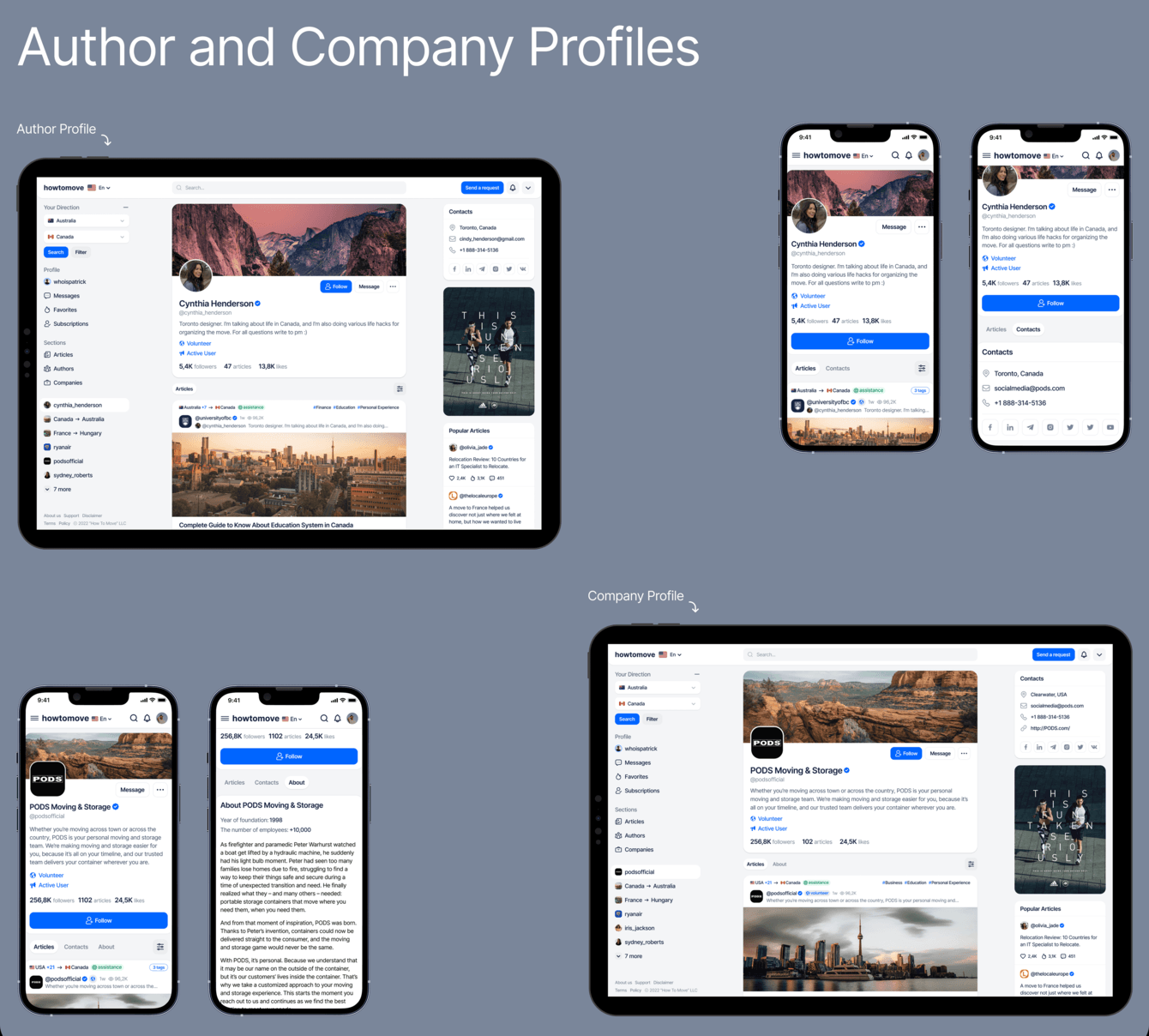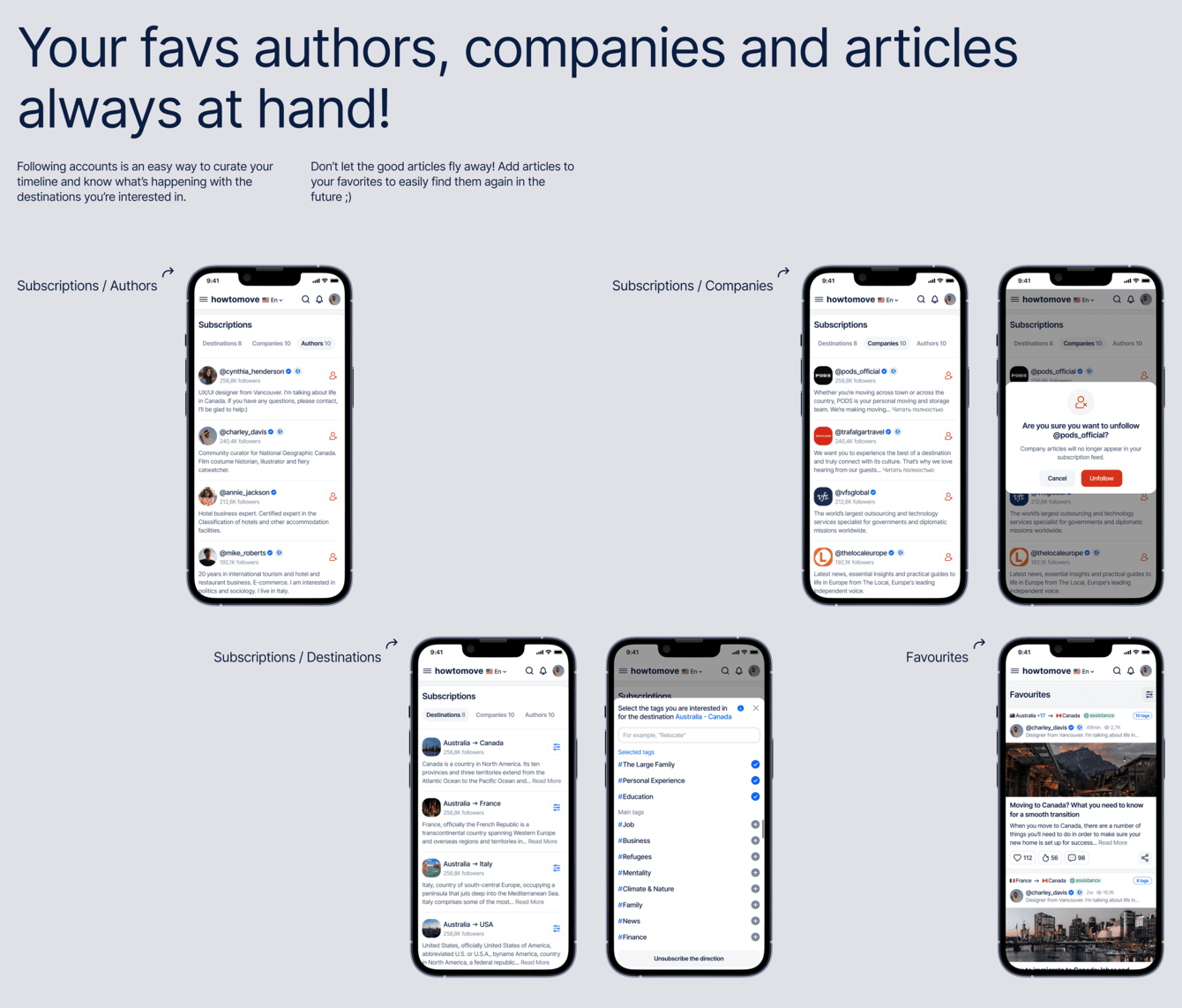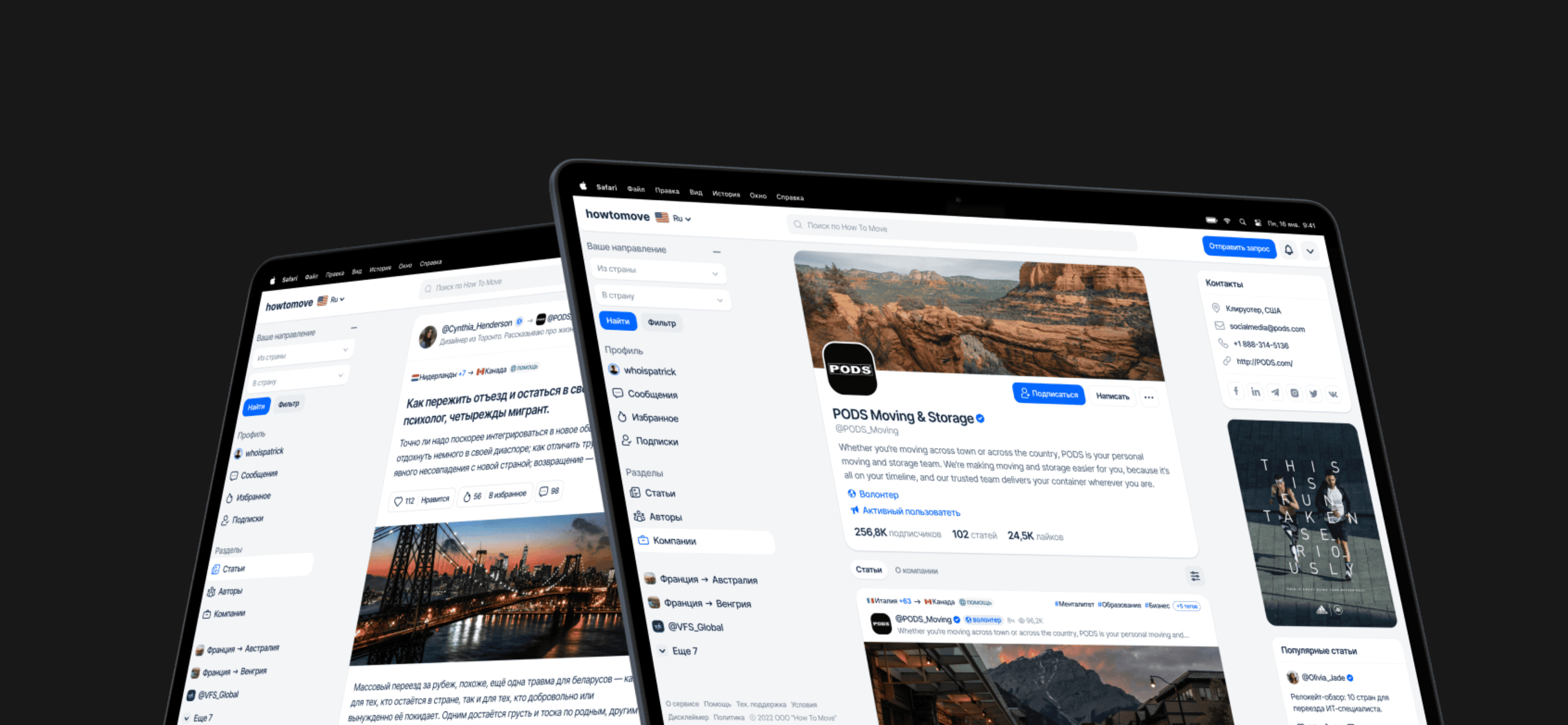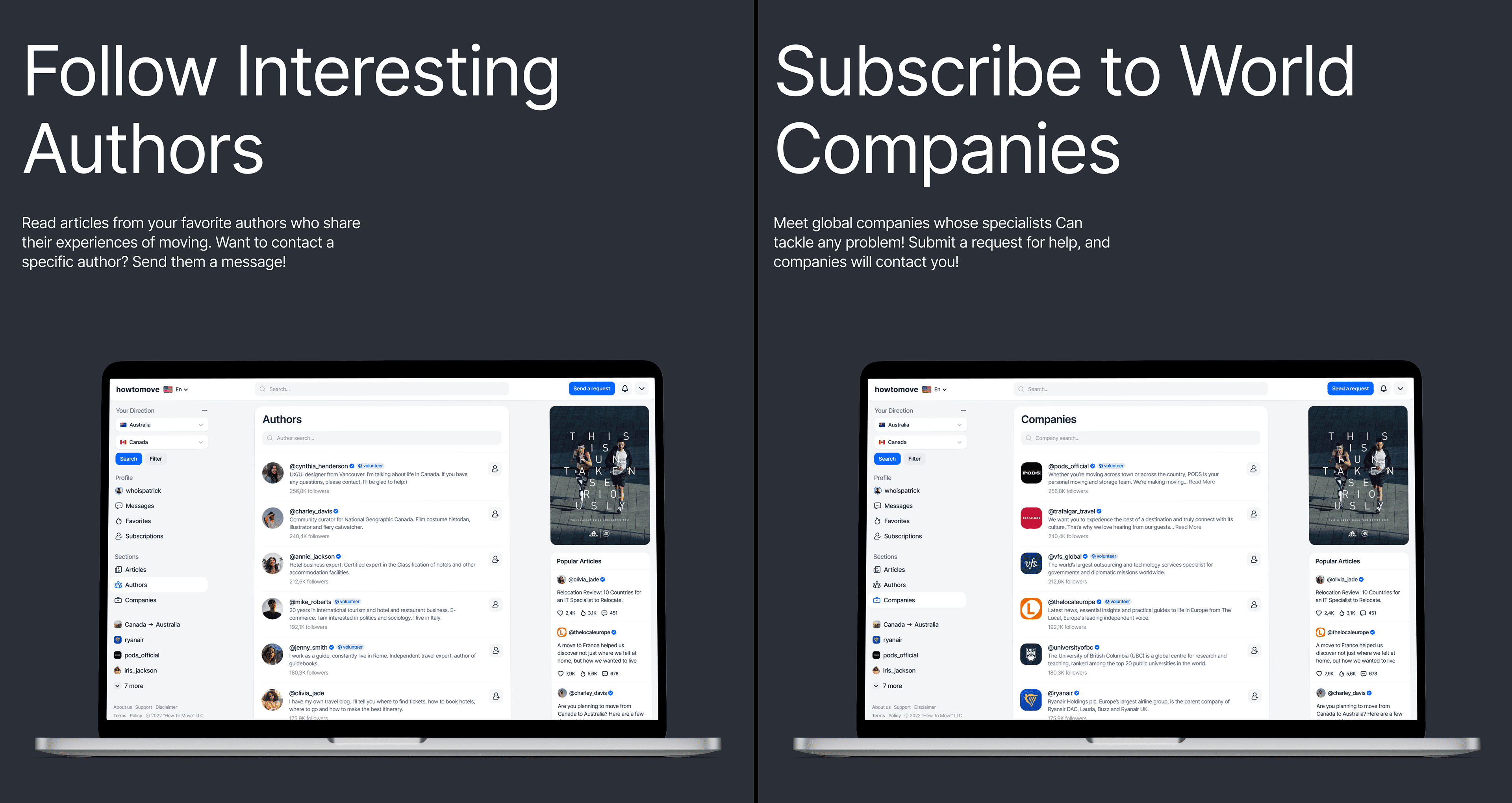 How to Move позволяет легко подписываться на авторов и компании, чтобы всегда быть в курсе актуальной информации о переезде. Сохраняйте понравившиеся статьи в избранное, чтобы быстро находить их в будущем. Удобные профили и система подписок обеспечивают персонализированный опыт как на десктопе, так и на мобильных устройствах.