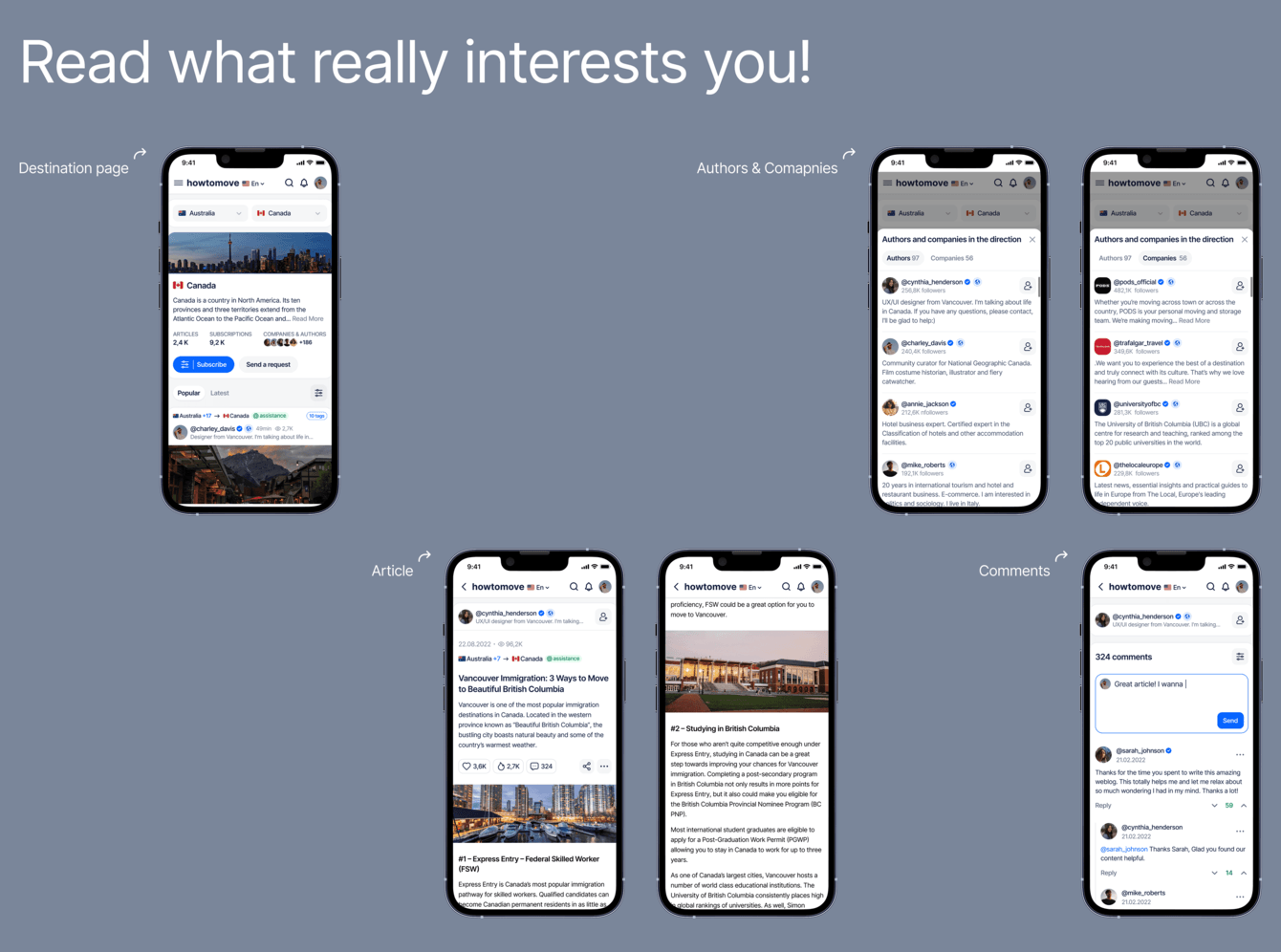Прежде чем создать How to Move, мы погрузились в мир тех, кто меняет страну проживания. Анализ рынка и конкурентов выявил главную проблему: несмотря на цифровую эпоху, процесс переезда остается фрагментированным. Люди по-прежнему вынуждены искать информацию по крупицам. Это определило нашу миссию — создать единую платформу, где практические знания, профессиональная помощь и личный опыт объединены в одном пространстве. Мы учли пожелания читателей, авторов и компаний, чтобы каждый получил действительно нужный ему функционал.