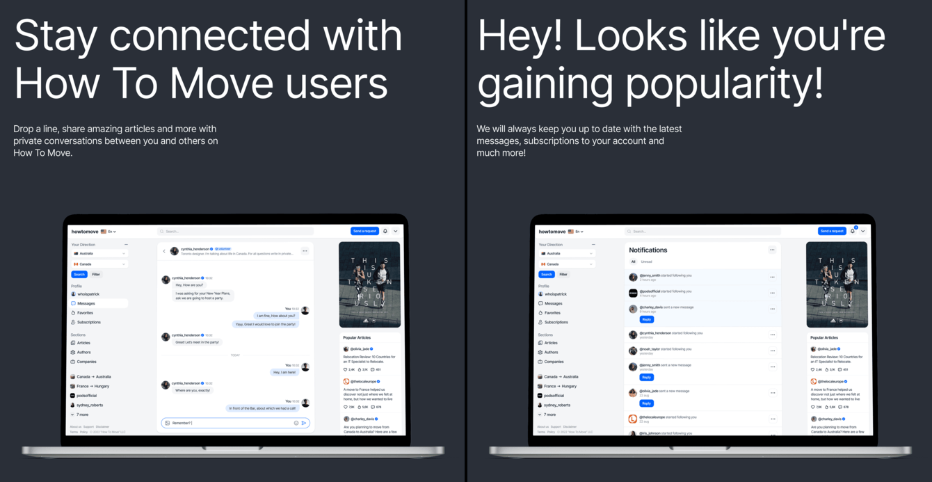 Платформа позволяет выбрать страну, читать актуальные статьи и комментарии других пользователей, подписываться на обновления и отправлять запросы на помощь. Всё, что нужно для релокации, собрано в одном месте.