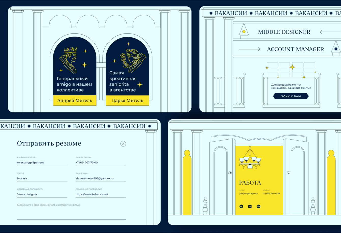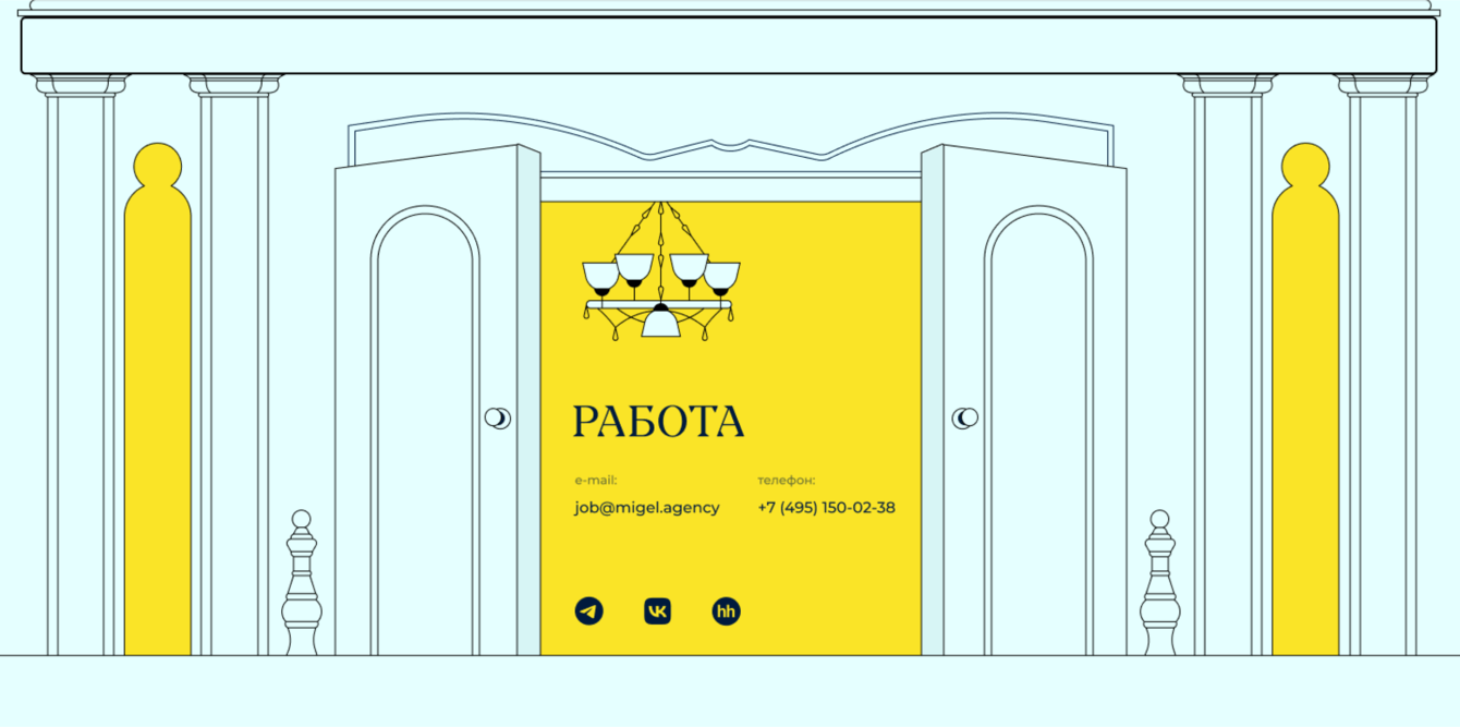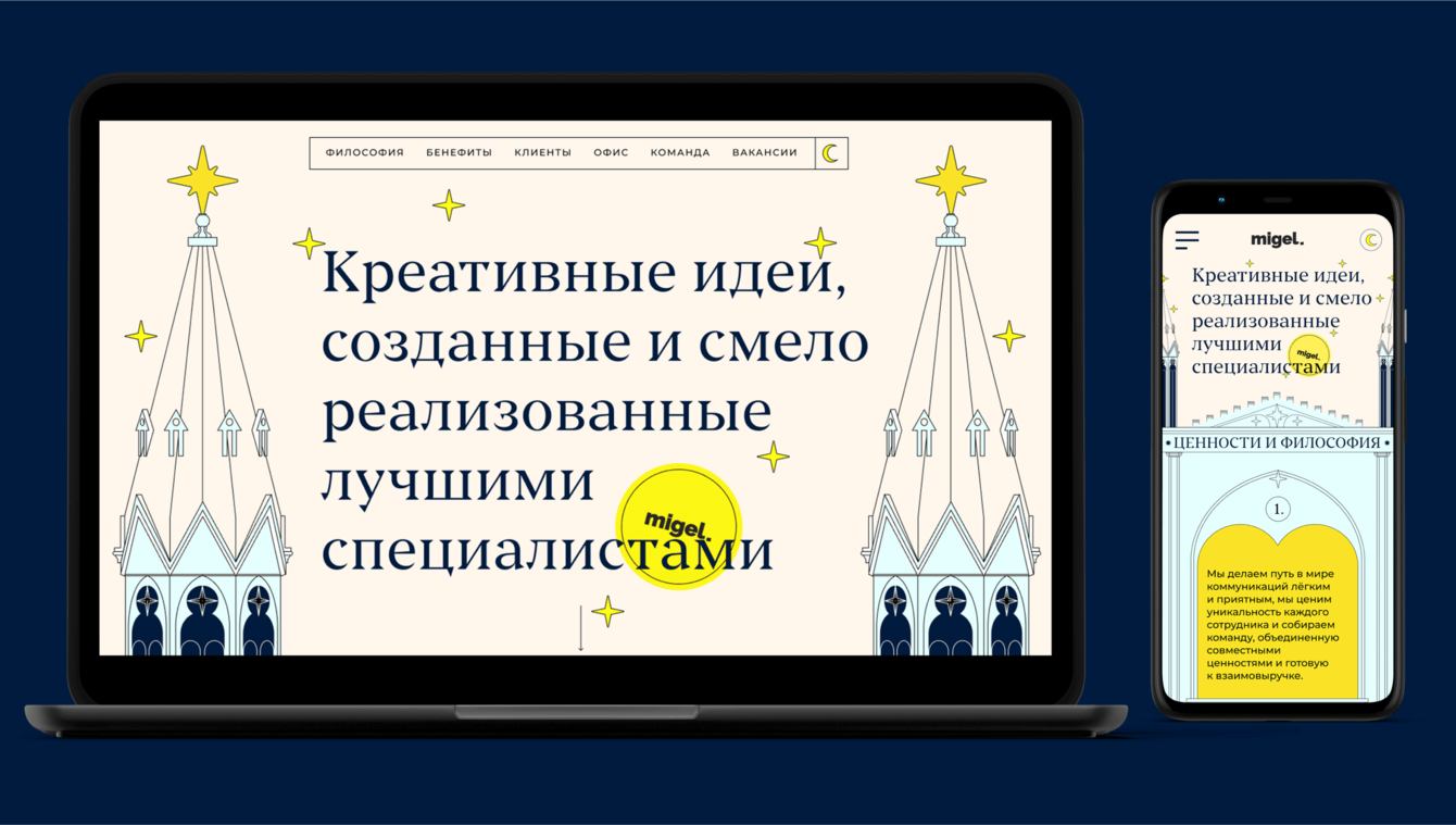 Если смотреть на замок от самых шпилей башен, на верхнем этаже расположены философия и ценности компании. При прокручивании это первое, на что мы обращаем внимание соискателей. В MIGEL AGENCY работают амбициозные, творческие и ответственные camaradas (исп. товарищи). Как раз это можно увидеть на нашем совместном фото в нижней части верхнего блока.