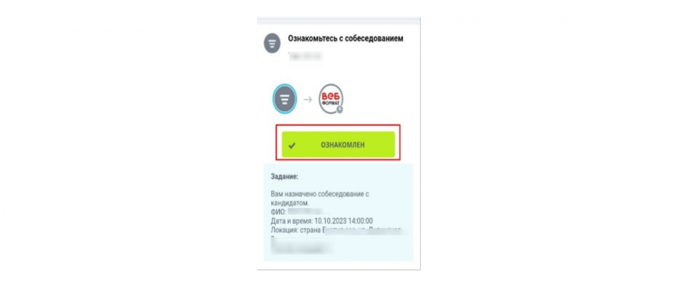 Когда назначено собеседование, то есть согласованы дата и время, локация и управляющий локации, то управляющему приходит задание в котором нужно ознакомиться с назначенным собеседованием.
