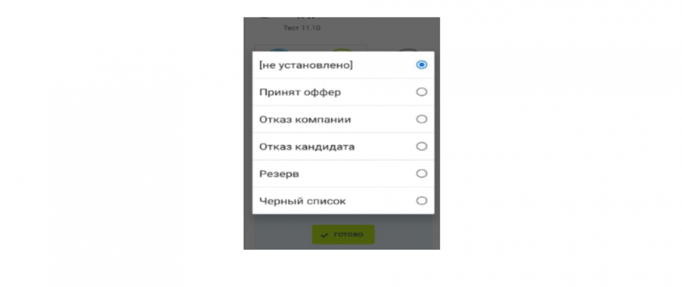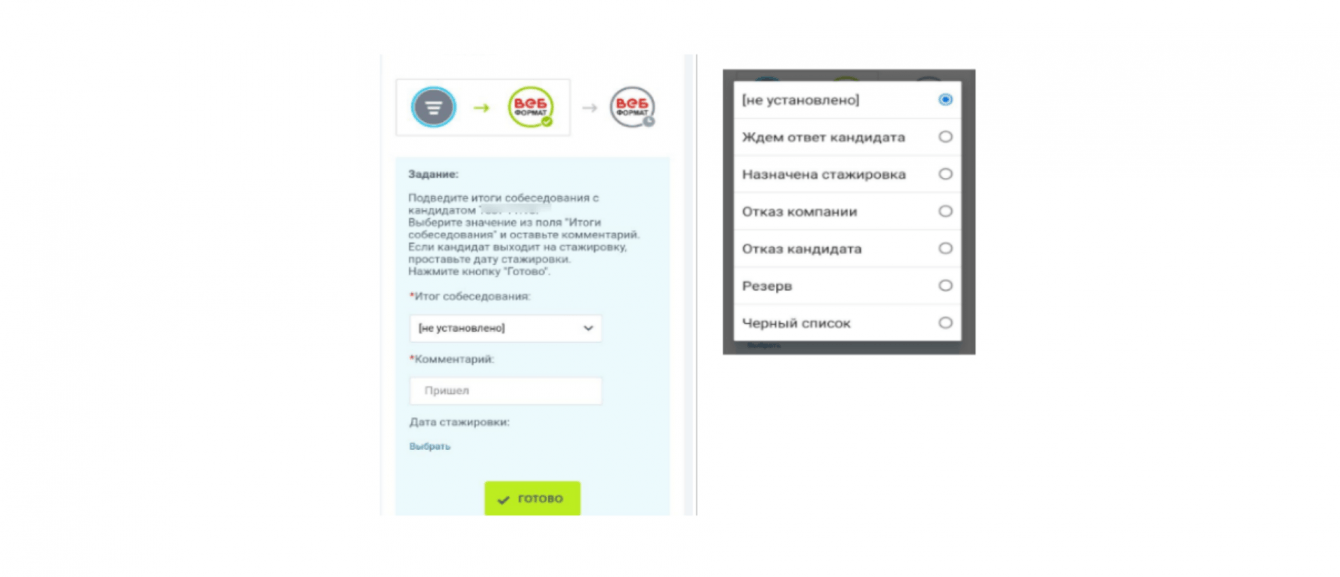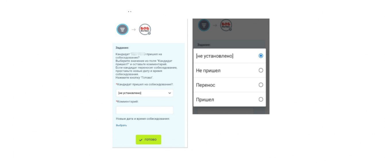 Если кандидат пришел, то следом придет задание в котором нужно выбрать итог собеседования.