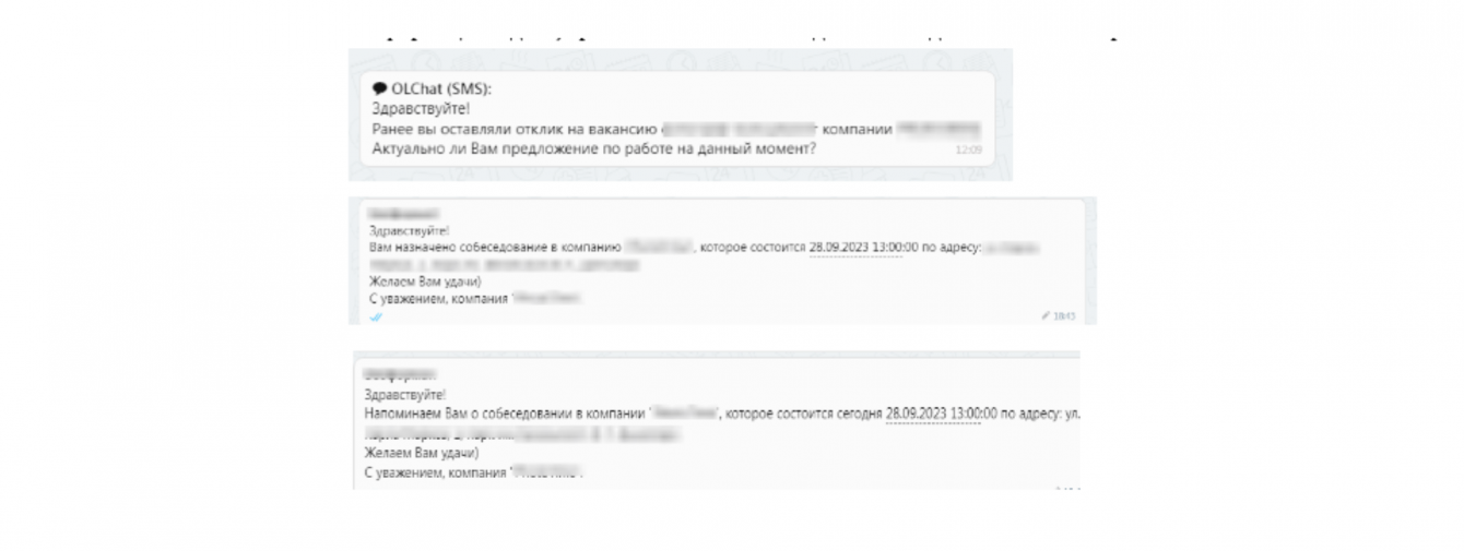 И работать дальше с этим кандидатом уже из Битрикс24 (звонить, писать, двигать по воронке подбора, передавать заказчику). Так же настроили автоматическую отправку сообщений кандидатам в whatsapp c уточнением актуальна ли вакансия, с назначенным собеседованием и с напоминанием о собеседовании. Информация о дате, времени и месте собеседования подтягивается из карточки кандидата.