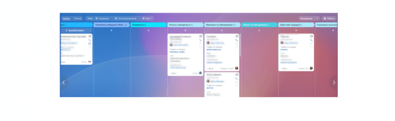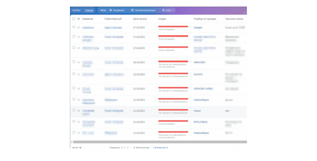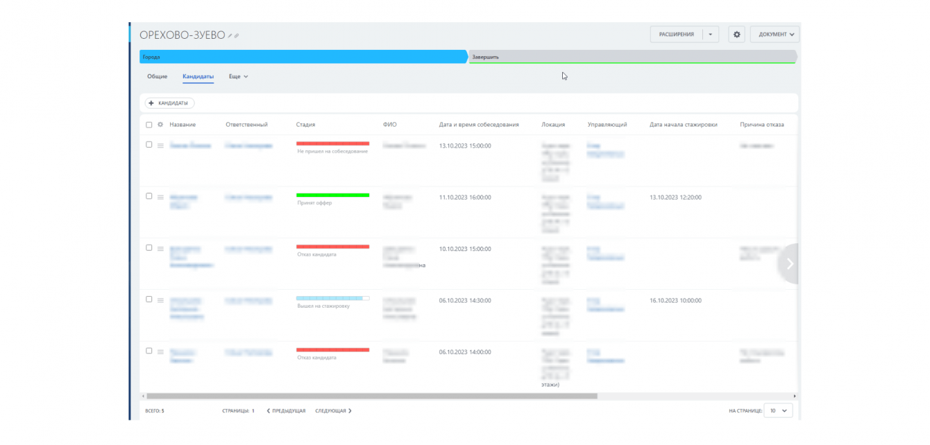 В каждой карточке города можно посмотреть количество персонала с которым работаете. Можно увидеть на какой стадии каждый кандидат, дату и время собеседования (если назначено), локацию, управляющего и прочее.