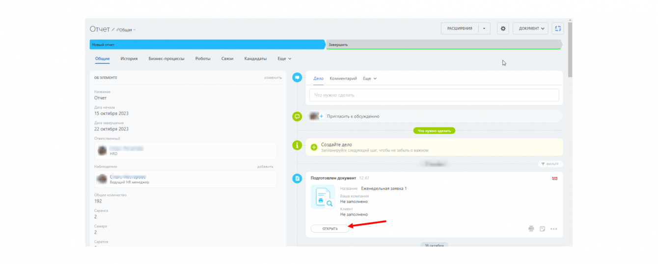 После того, как все региональные управляющие подали заявку на подбор по своим городам HRD и Ведущий HR-менеджер получают об этом уведомление. Из уведомления они могут перейти в карточку отчета по городам и посмотреть сформированный документ.