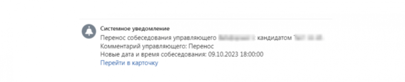 Если кандидат не пришел, то карточка переместится в соответствующий провальный статус, комментарий перенесется в причину отказа, а рекрутеру придет об этом уведомление. Так же управляющий имеет возможность перенести собеседование на новую дату, рекрутер будет уведомлен об этом.