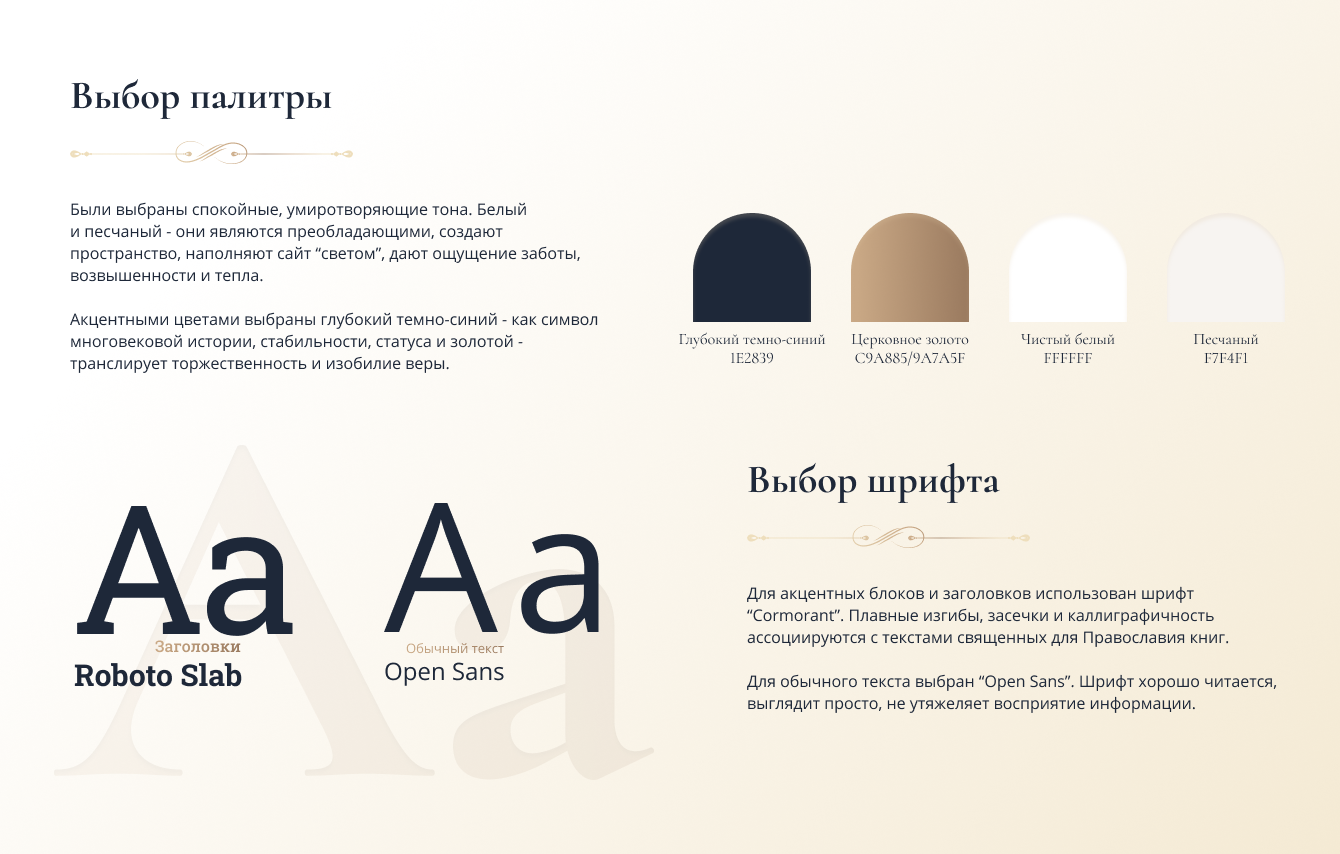 Такое цветовое и композиционное решение позволяет сайту оставаться современным, не теряя уважения к традиции и духовному контексту.