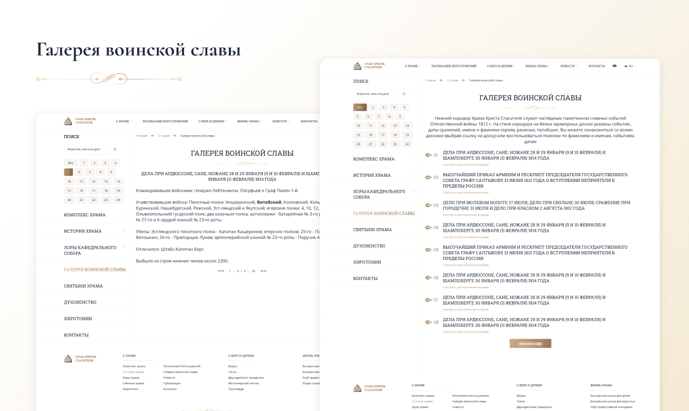 Центральным элементом сайта стала Галерея Воинской Славы — самостоятельный смысловой раздел, посвящённый героям и событиям Отечественной войны 1812 года. Галерея позволяет пользователям погрузиться в историю через имена, даты и места сражений, выстраивая личный и эмоциональный контакт с прошлым.