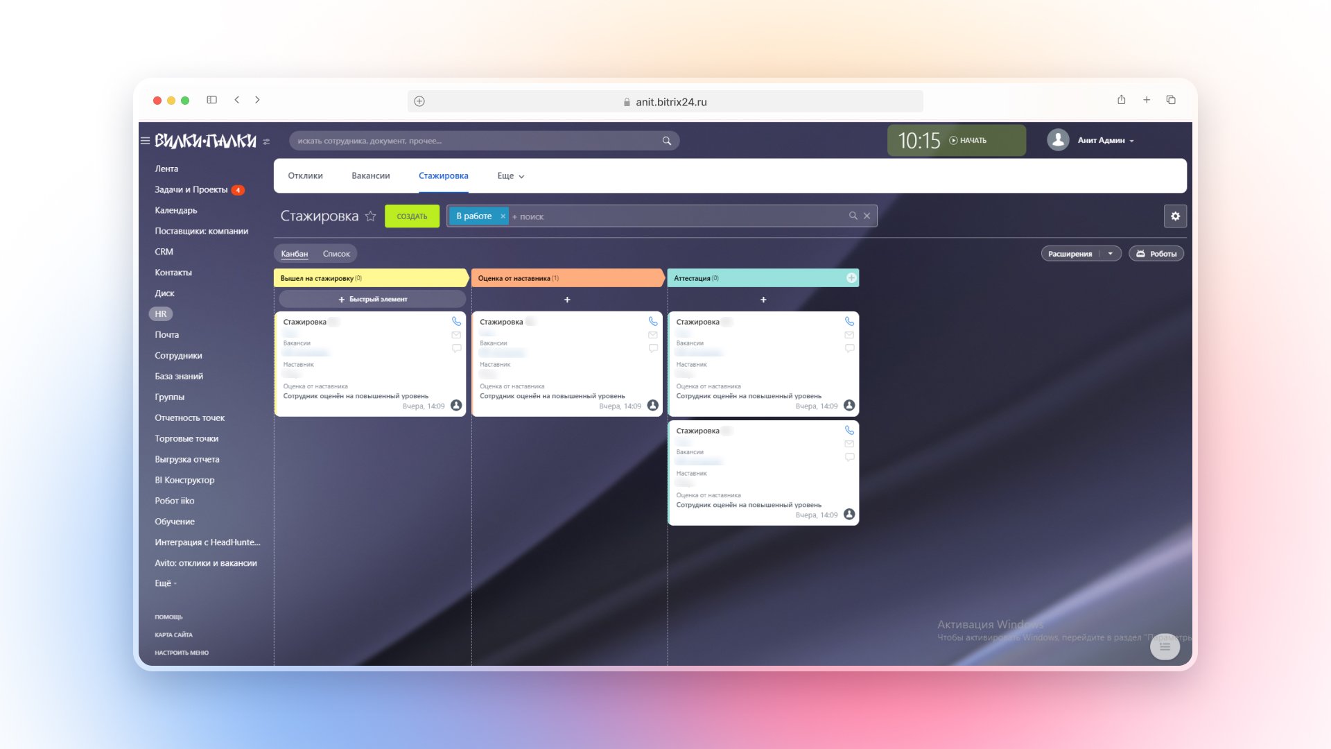 Создали отдельную воронку «Стажировка». Каждый новый сотрудник проходит по этапам адаптации, HR-отдел контролирует прогресс, а система автоматически ставит задачи наставникам. По результатам стажировки проводится аттестация, которая фиксируется в CRM. Это позволило централизованно отслеживать успехи новых сотрудников и вовремя реагировать на трудности.