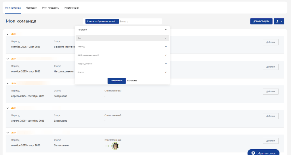В карточке сотрудника объединены корпоративные показатели и персональные цели, согласованные с руководителем.